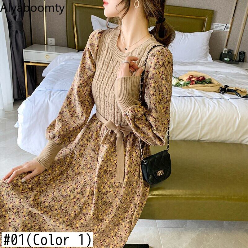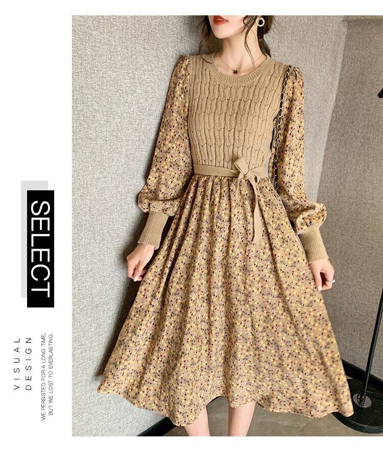 送料無料୨♥୧ オータムウィンターレディースミディドレス ニットコーデュロイパッチワークフローラルスリーブ ランタンスリーブ 秋物 冬物 花柄 AOS57677260110