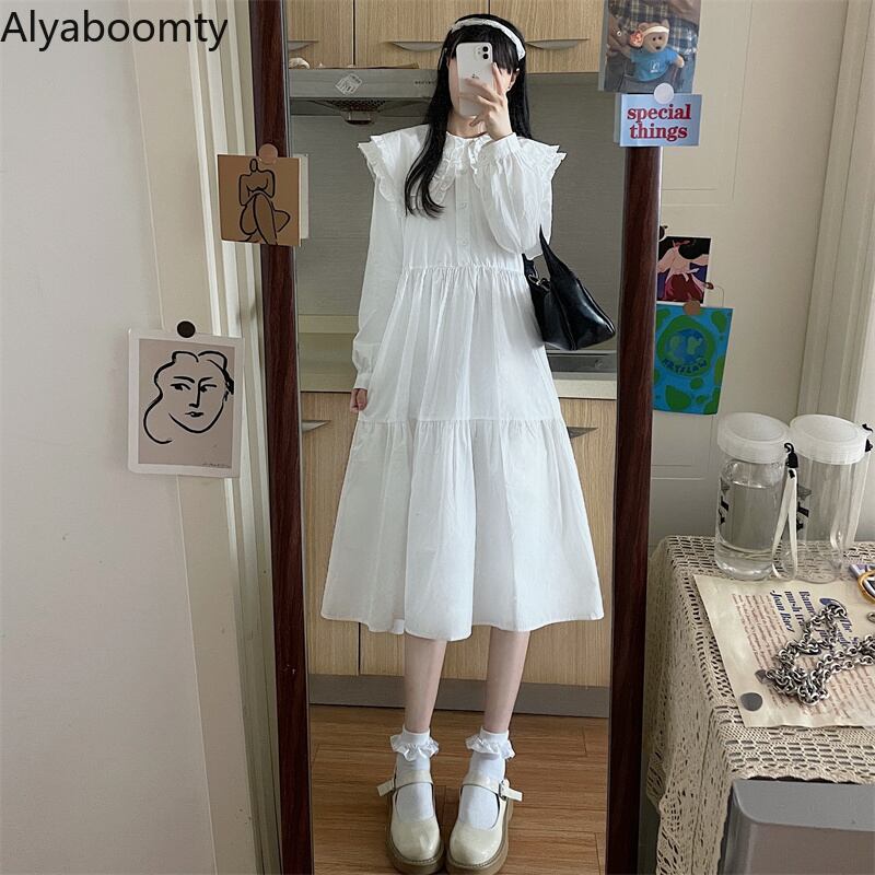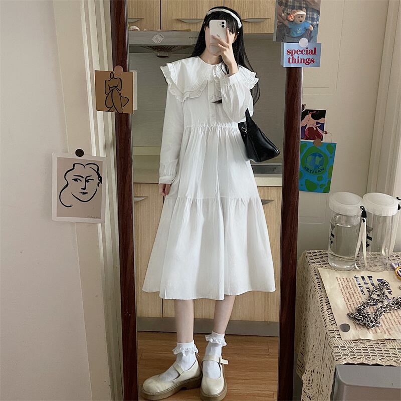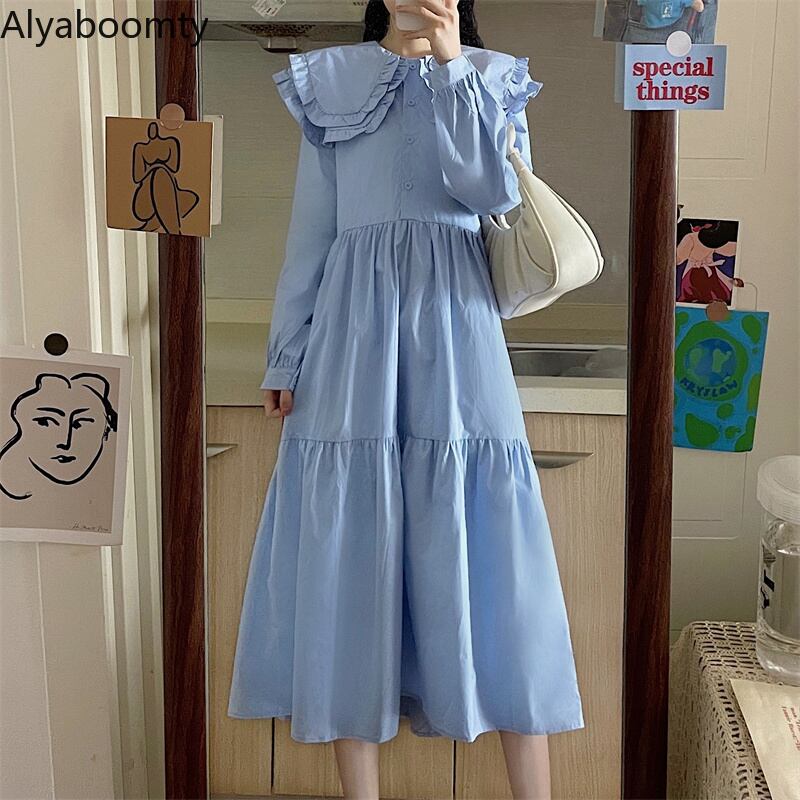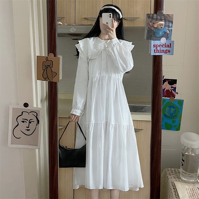 送料無料୨♥୧ スタイルオータムレディースドレス カラーホワイトブルーフリルロング レッド ラッフル 大人ガーリー スウィート キュート カジュアル 秋物 AOS50701581684