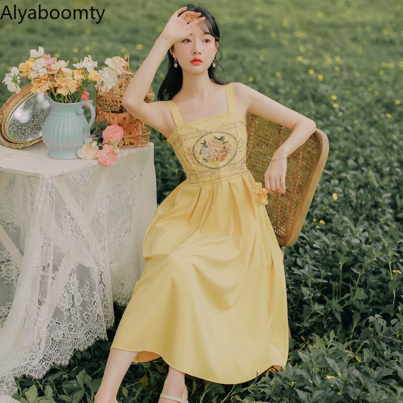 送料無料୨♥୧ サマーレディースドレス ブルーイエローフローラル刺繍ノースリーブヴィンテージAラインミディ 大人ガーリー スウィート キュート カジュアル 夏物 花柄 ビンテージ AOS78924586358
