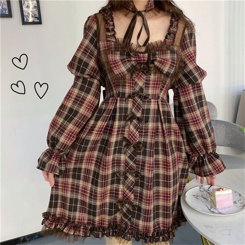 送料無料୨♥୧ スタイルオータムレディースミニドレス カラー格子柄リボンフリル ラッフル 秋物 スクウェア AOS91239753499