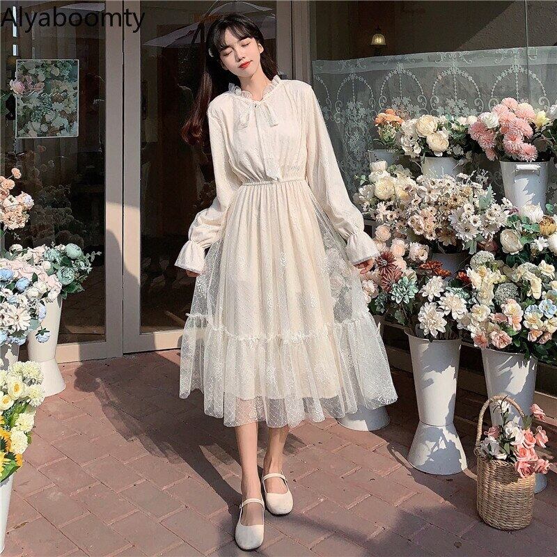 送料無料୨♥୧ スタイルスプリングオータムレディースミディドレス リボンカラーホワイトフローラルレースフリル ラッフル 大人ガーリー スウィート キュート カジュアル 春物 秋物 花柄 AOS18315271091