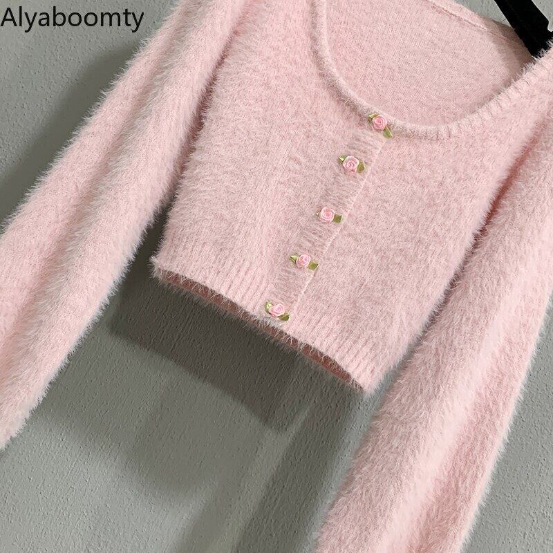 送料無料୨♥୧ ese原宿スプリングオータムレディースストリートウェアセーター オルチャンピンクモヘアショートローズ収穫トップス 可愛いカワイアウター AOS50236817907