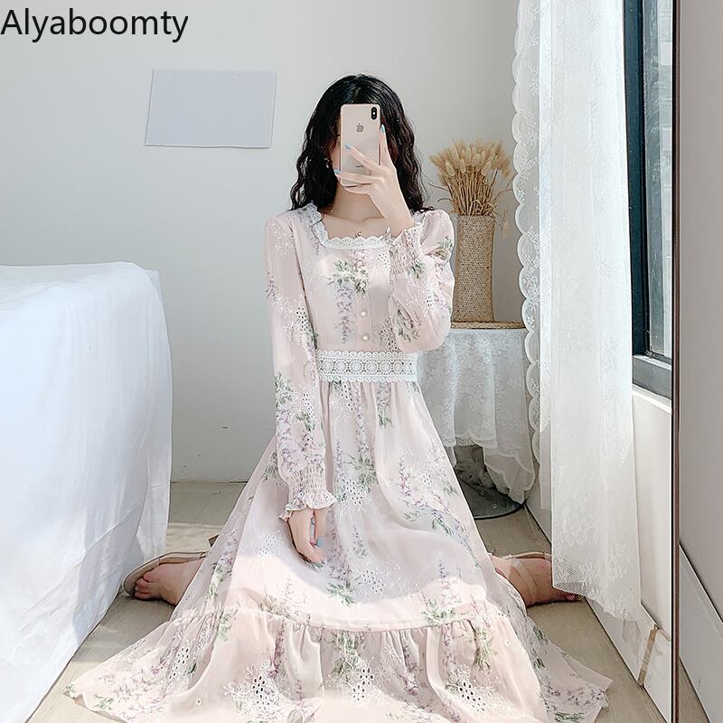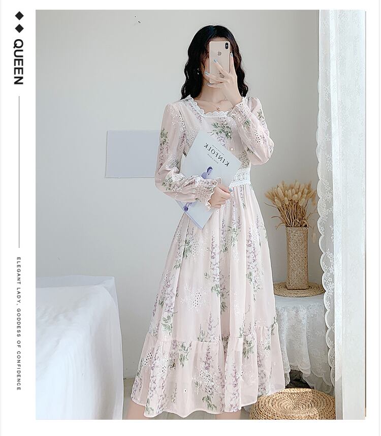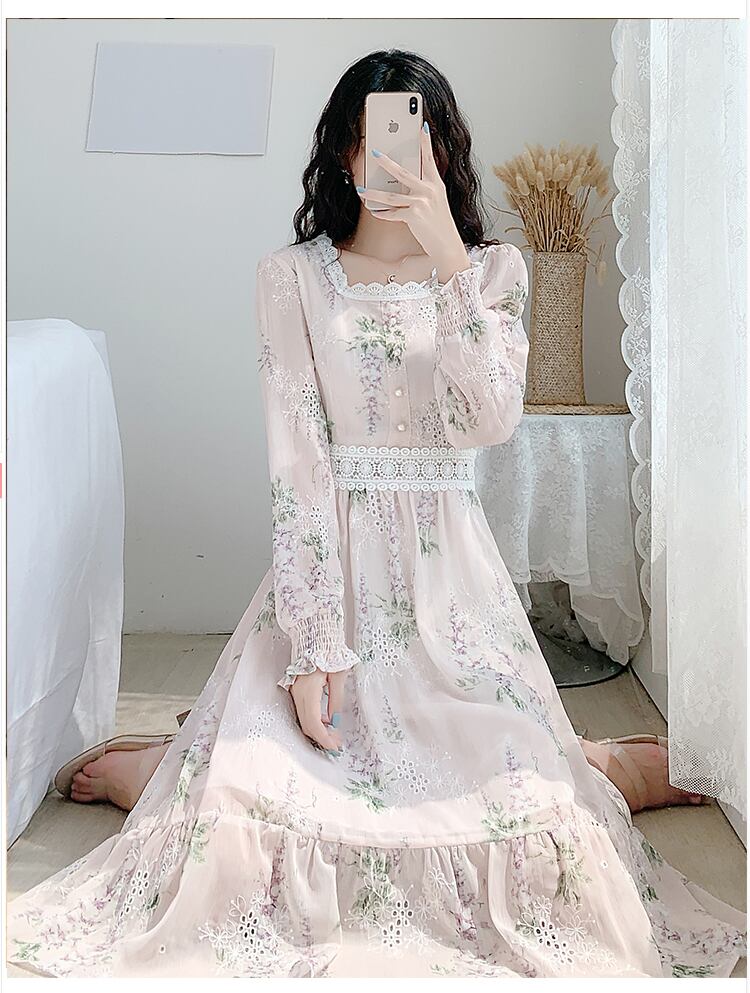 送料無料୨♥୧ スプリングオータムレディースミディフリルドレス 平方カラーフローラルホローでる刺繍長袖スリーブシフォンシック AOS98728283884