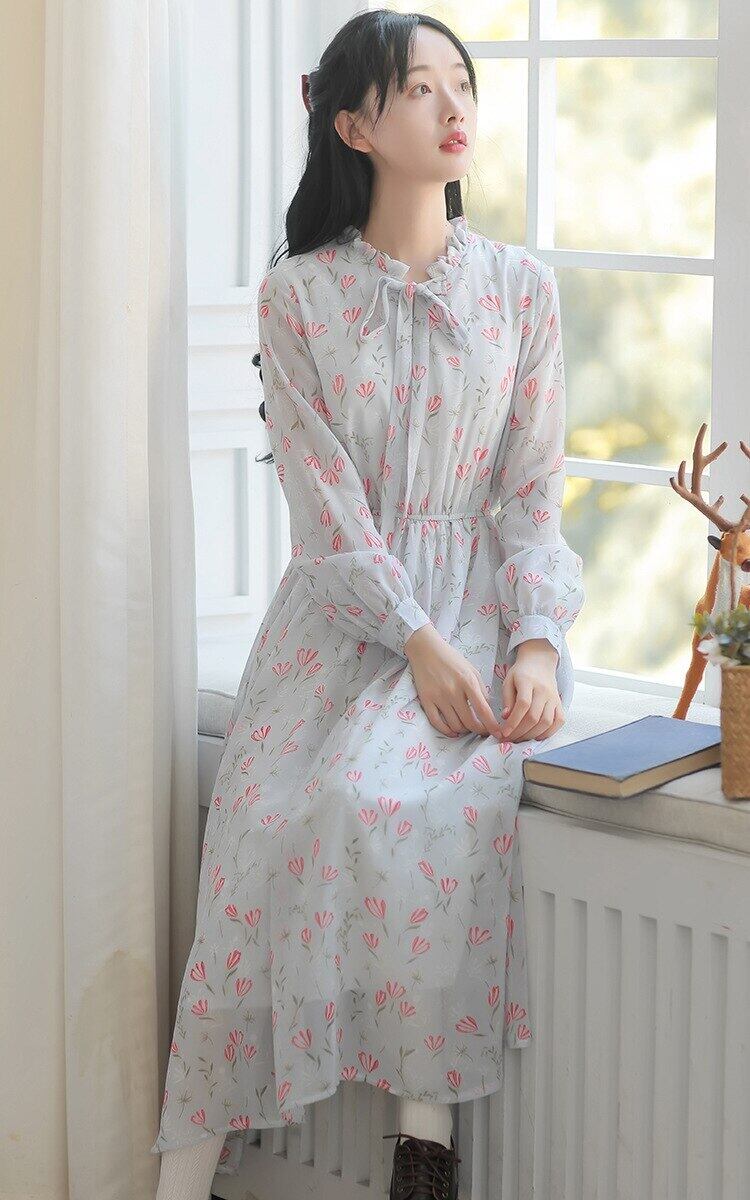 送料無料୨♥୧ スプリングオータムレディースミディドレス カラーリボンフローラルプリントシフォンロング 大人ガーリー スウィート キュート カジュアル 春物 秋物 花柄 AOS1255516651