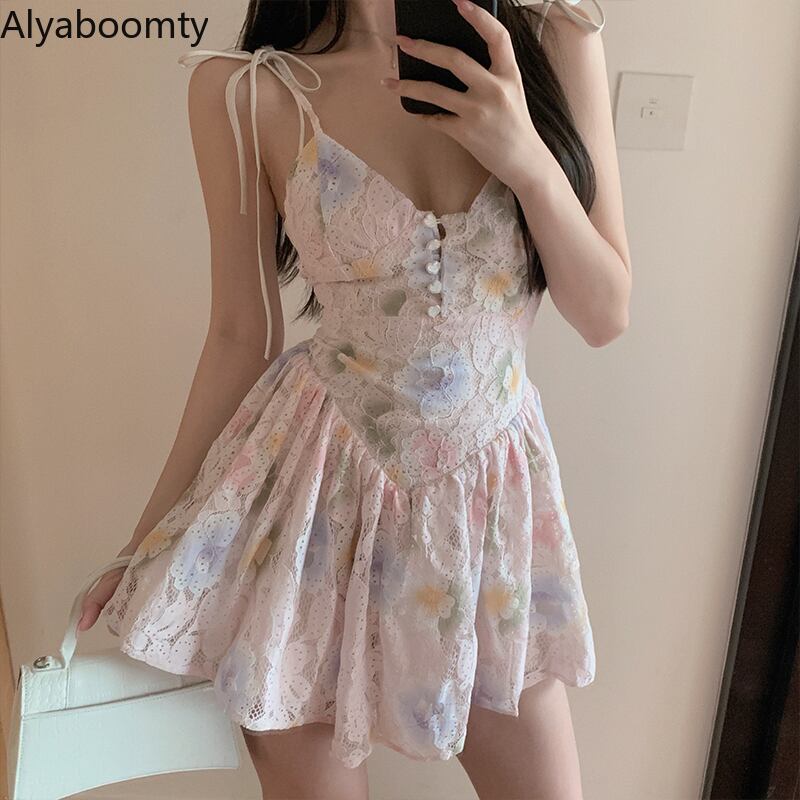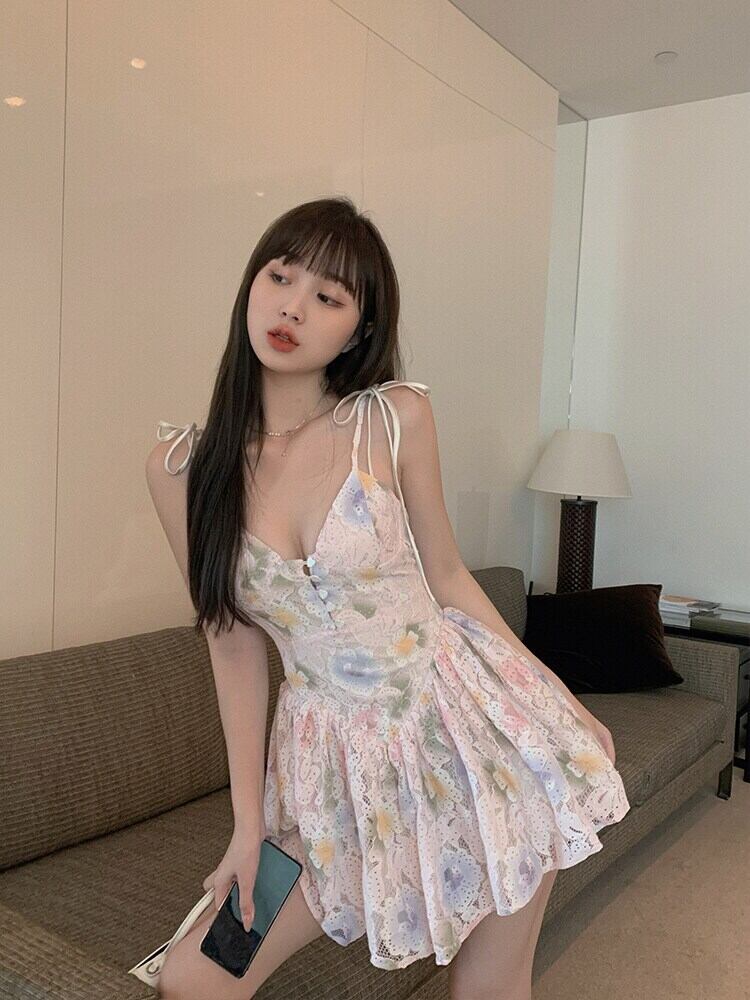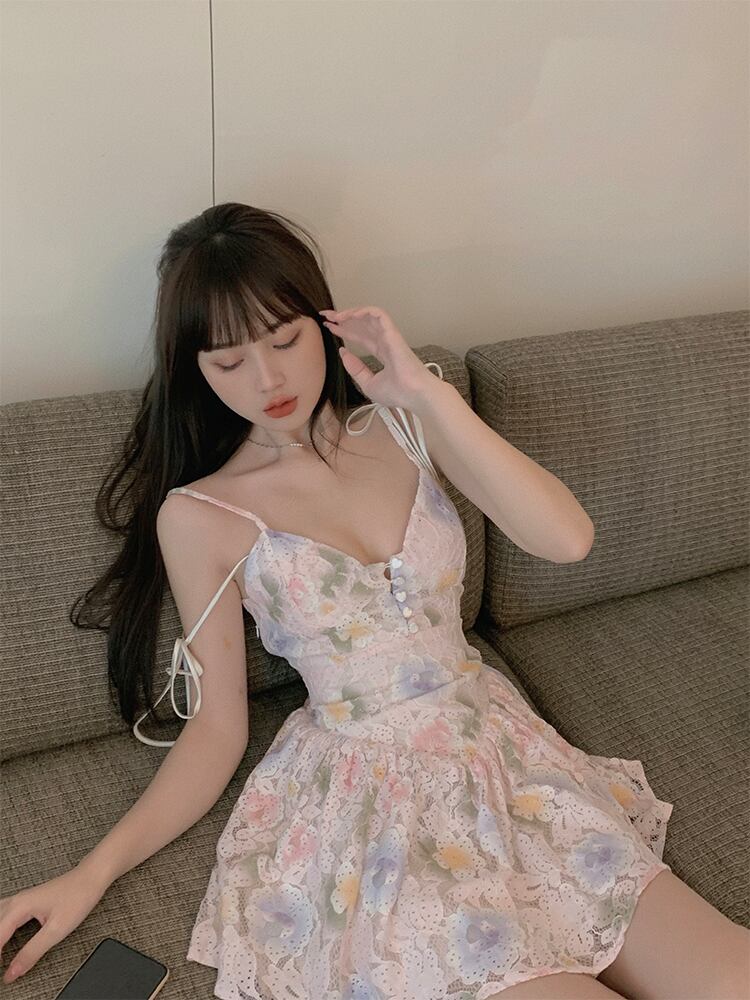 送料無料୨♥୧ サマーレディースミニレースドレス Vネックカラーバックレスバンド 大人ガーリー スウィート キュート カジュアル 夏物 AOS20720305596