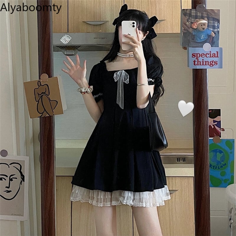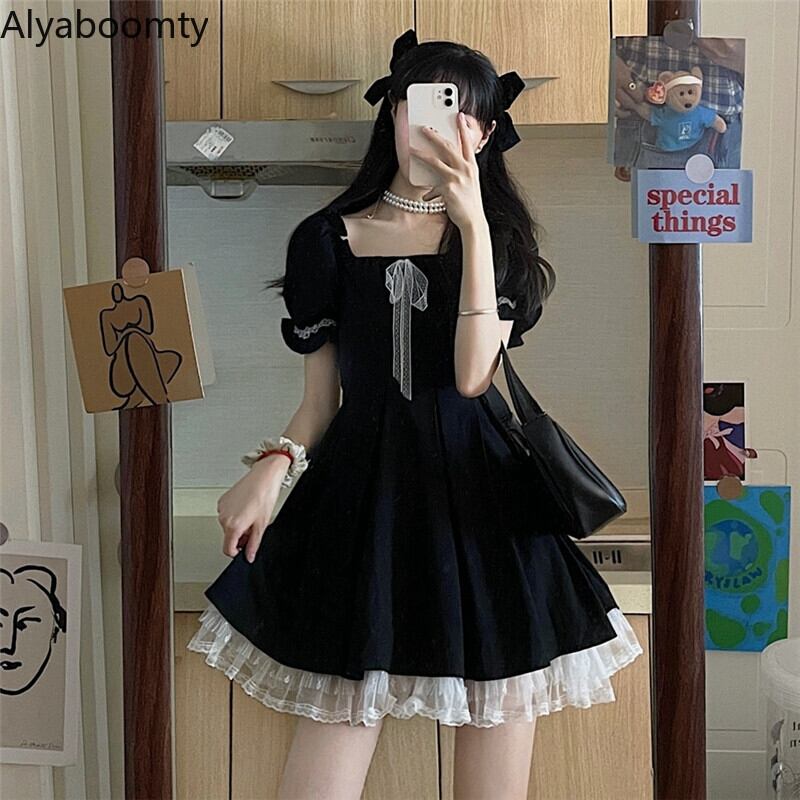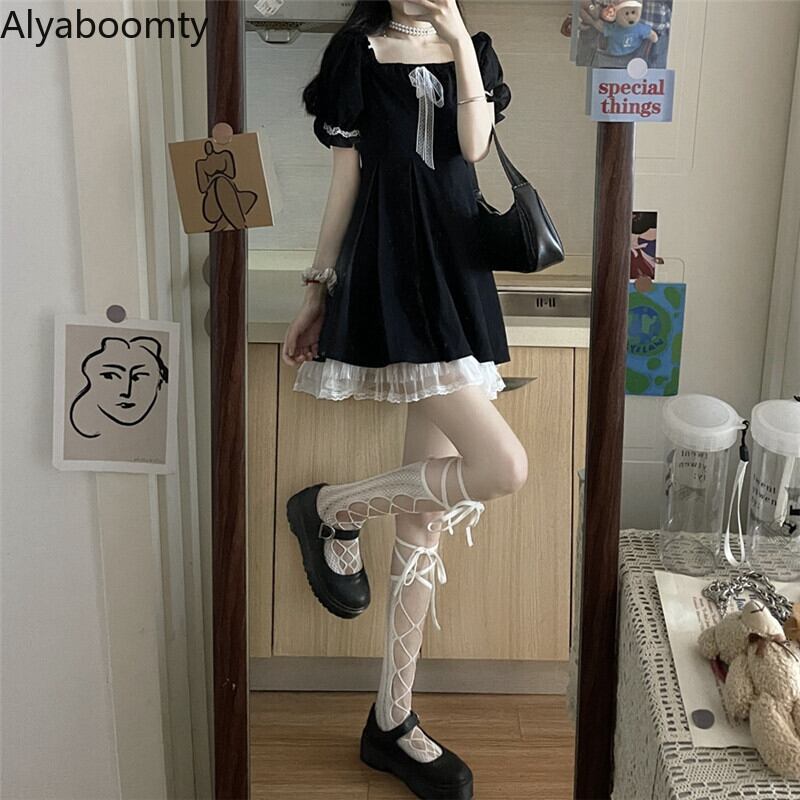 送料無料୨♥୧ 2021ese原宿サマーレディースブラックミニドレス 平方カラーリボンゴシック可愛いフリルロリータパーティー AOS48590726985