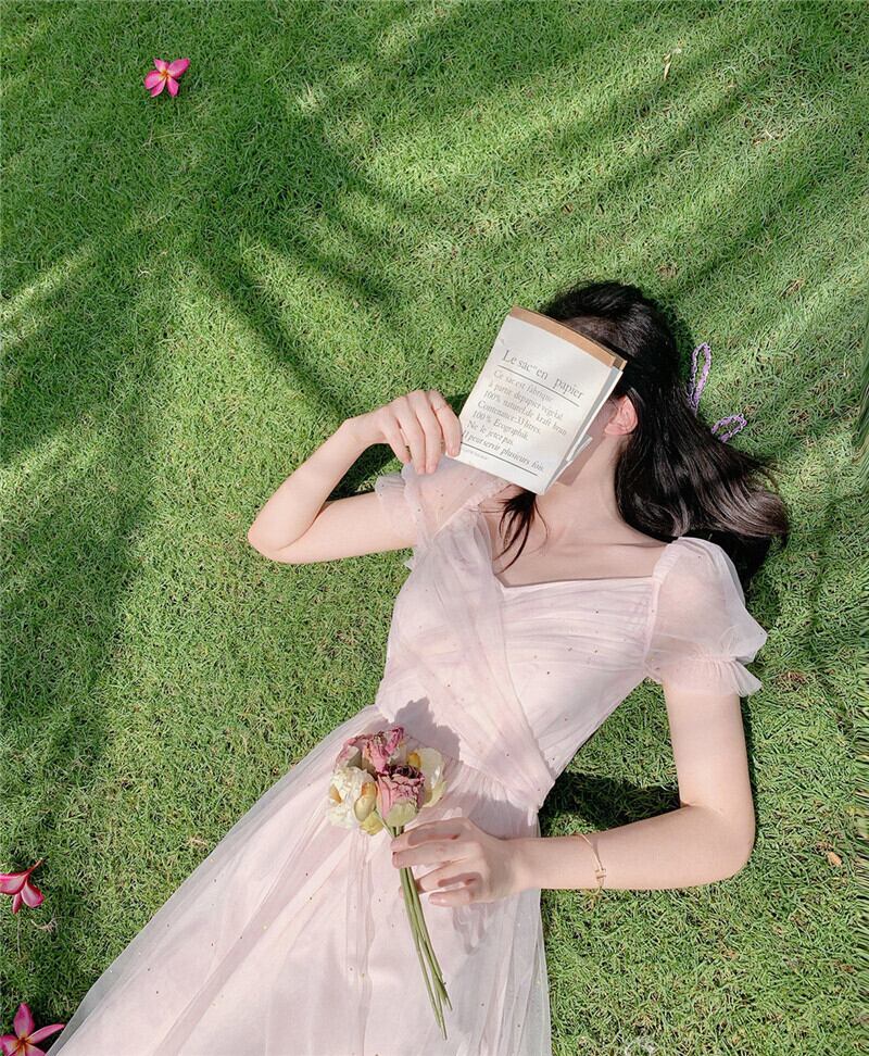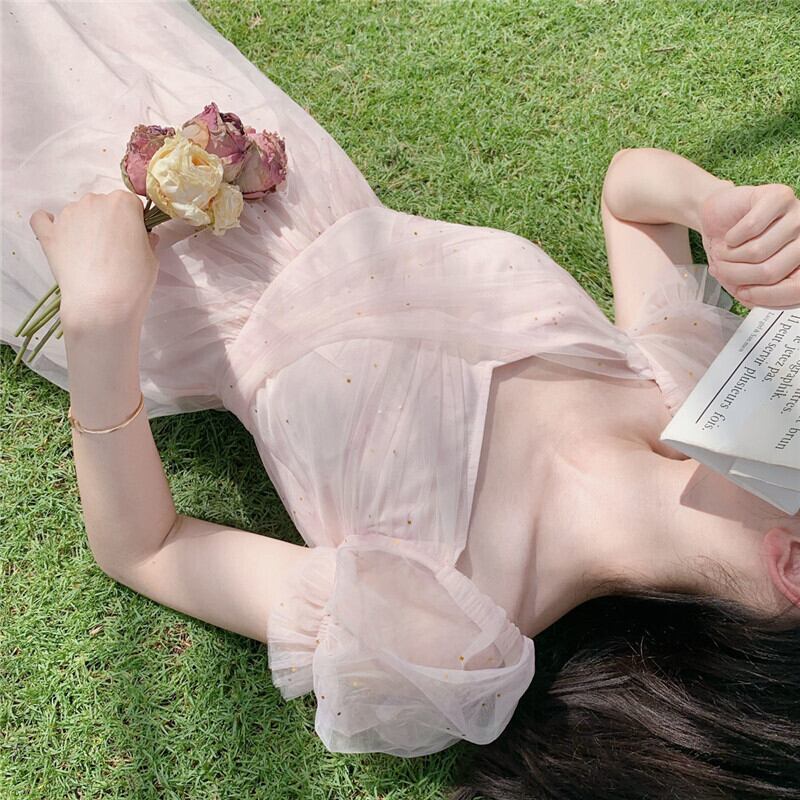 送料無料୨♥୧ 2021サマーレディース妖精メッシュAラインドレス ロマンチックピンクブルークロスバンドシンプルスタイリッシュパフスリーブチュール AOS58091101031