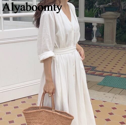 送料無料୨♥୧ サマーオータムレディースロングシャツ ドレス ホワイトブラックVネックヴィンテージルーズ七部袖スリーブカーディガン コットン 夏物 秋物 ビンテージ AOS31785113807