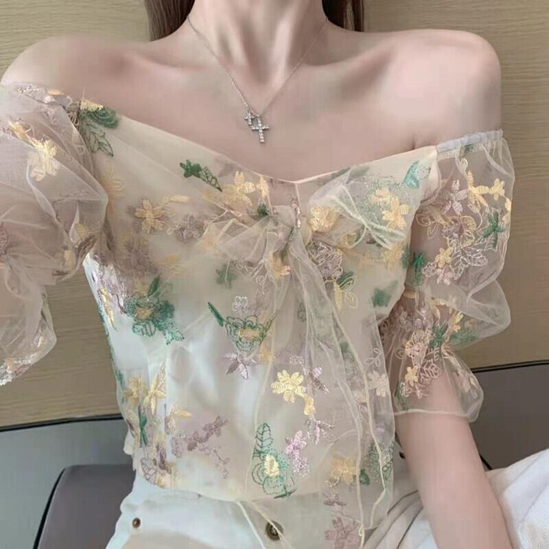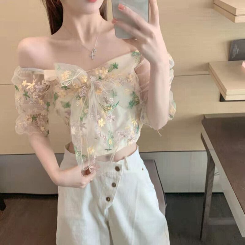 送料無料୨♥୧ サマーレディースクロップトップ トップス フローラル刺繍メッシュブラウス スリーブバンドシャツ 夏物 花柄 AOS75973520702