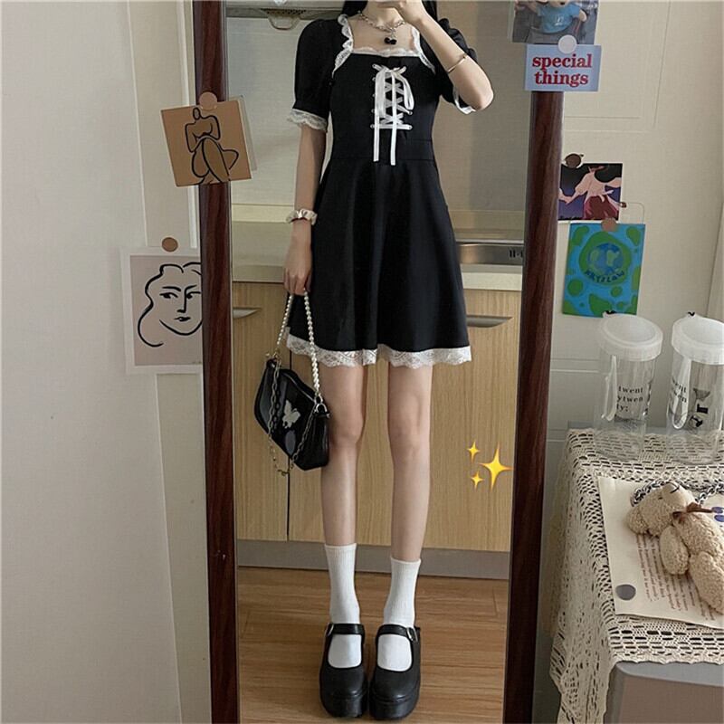 送料無料୨♥୧ サマーレディースブラックミニドレス カラーレースバンドスタイルストリートウェア 大人ガーリー スウィート キュート カジュアル かわいい 夏物 スクウェア AOS52219454494