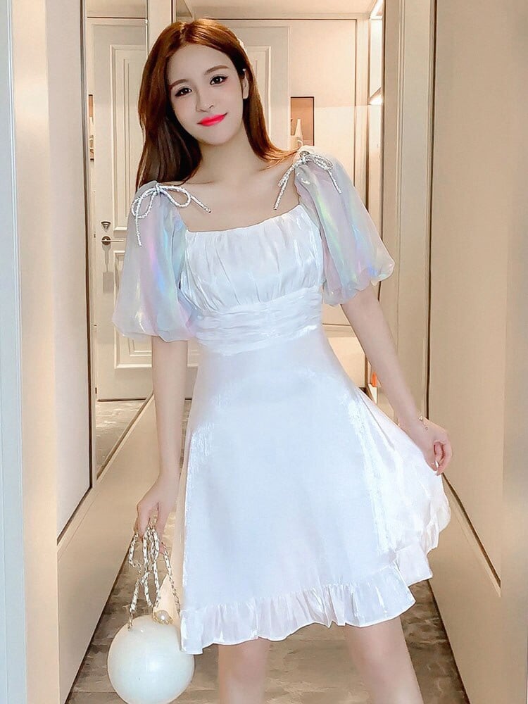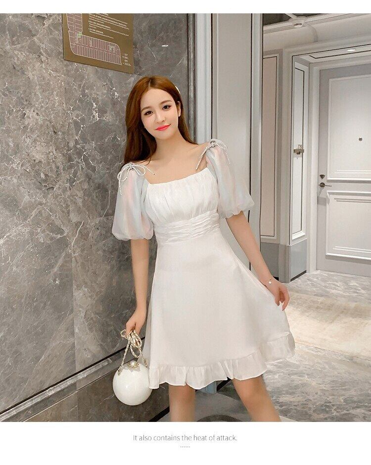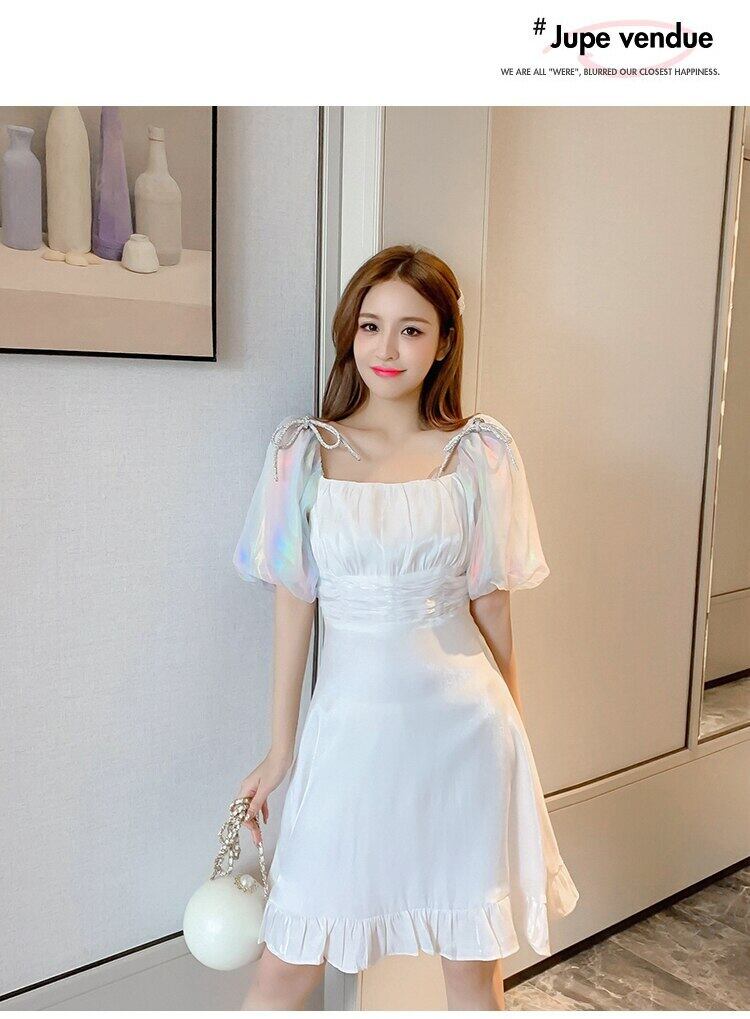 送料無料୨♥୧ スタイルサマーレディースドレス カラーホワイトスリムスリーブフリル ラッフル 夏物 スクウェア AOS56580820382