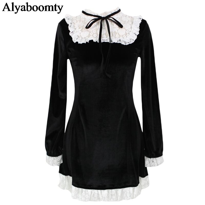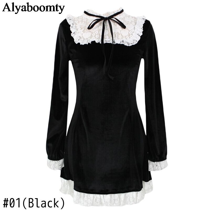 送料無料୨♥୧ オータムスプリングレディースブラックミニドレス スタイルカラーベルベットレースフリル ラッフル 春物 秋物 AOS78711451524
