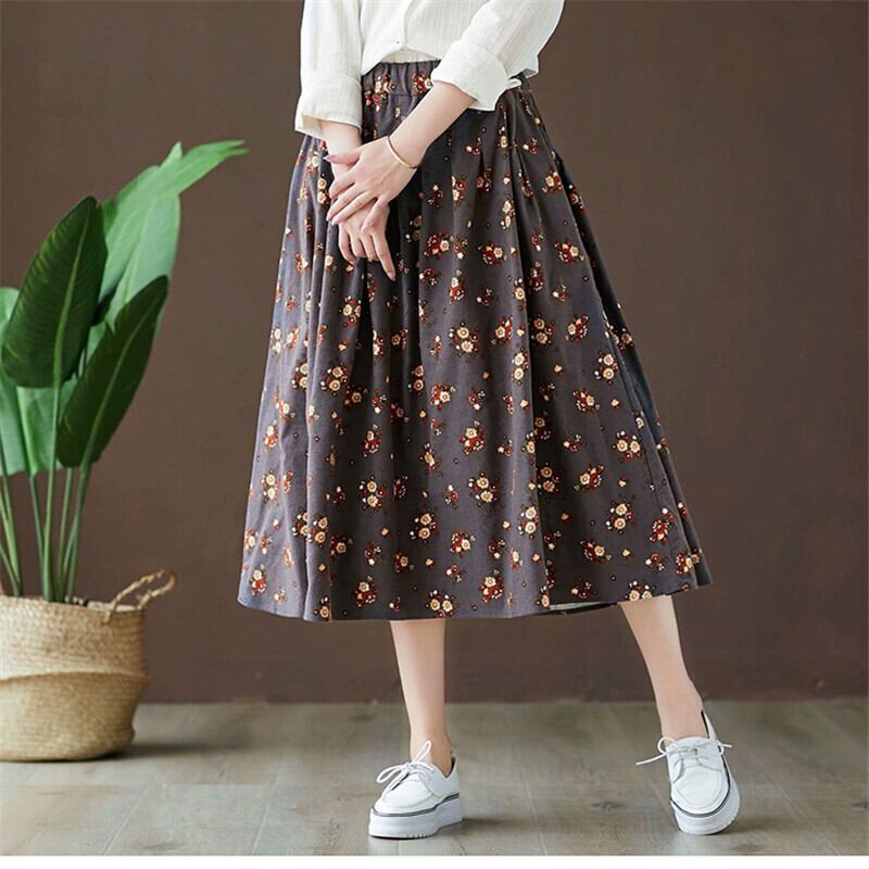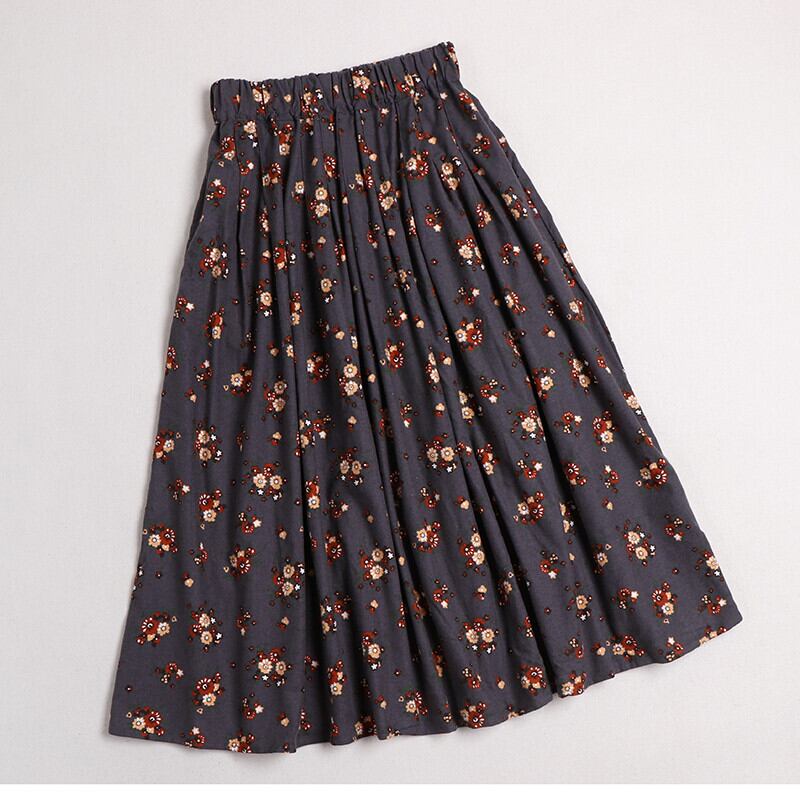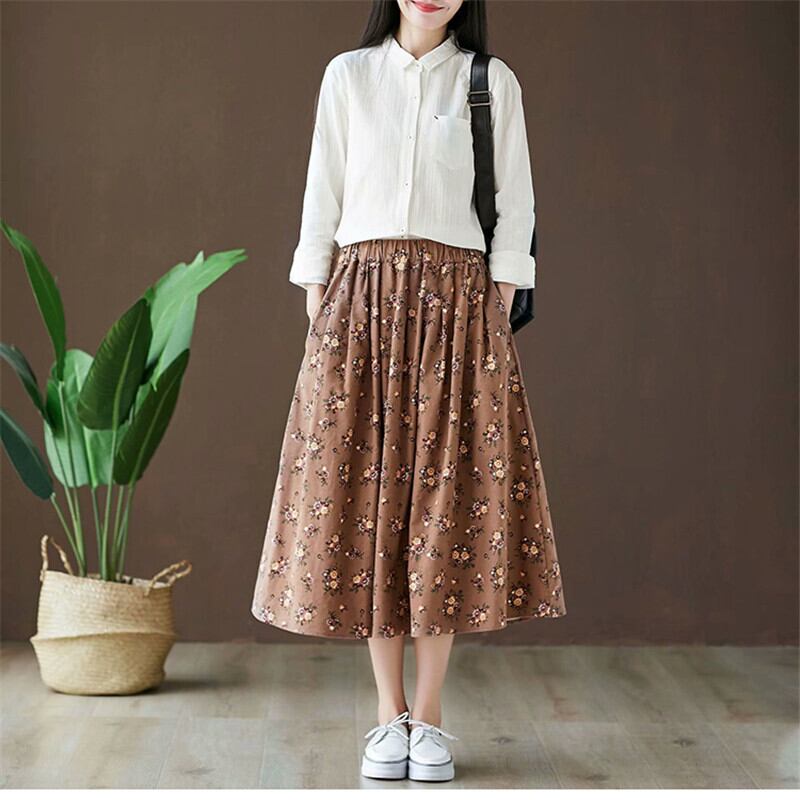 送料無料୨♥୧ オータムスプリングレディースヴィンテージAラインスカート ウェストグレーブラウンフローラルプリントミディ コットン 大人ガーリー スウィート キュート カジュアル 春物 秋物 花柄 ビンテージ AOS29972912707