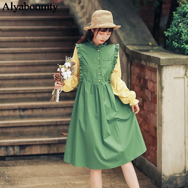 送料無料୨♥୧ オータムレディースドレス カラーパッチワークルーズ長袖スリーブ ロング 大人ガーリー スウィート キュート カジュアル 秋物 AOS27297530129