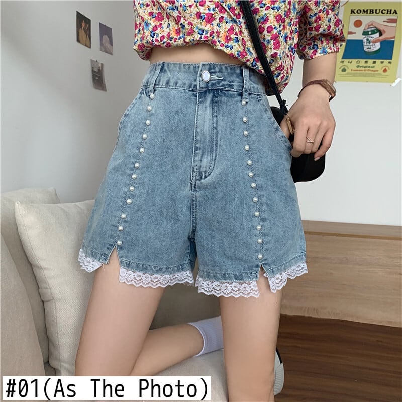 送料無料୨♥୧ サマーレディースストリートウェアショーツ ウェストブルーパールレース 大人ガーリー スウィート キュート カジュアル かわいい 夏物 ブルマー 真珠 AOS8205134273