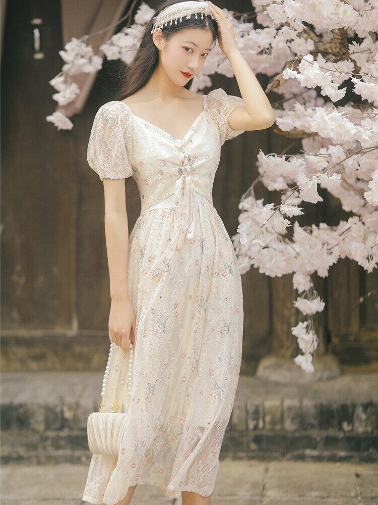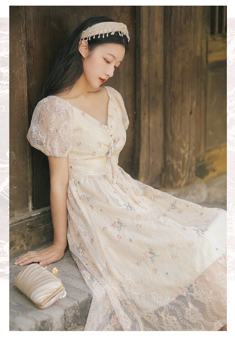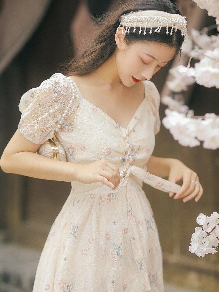 送料無料୨♥୧ サマーレディース刺繍ミディドレス Vネックフローラルバンドスリーブ 夏物 花柄 AOS78184806317