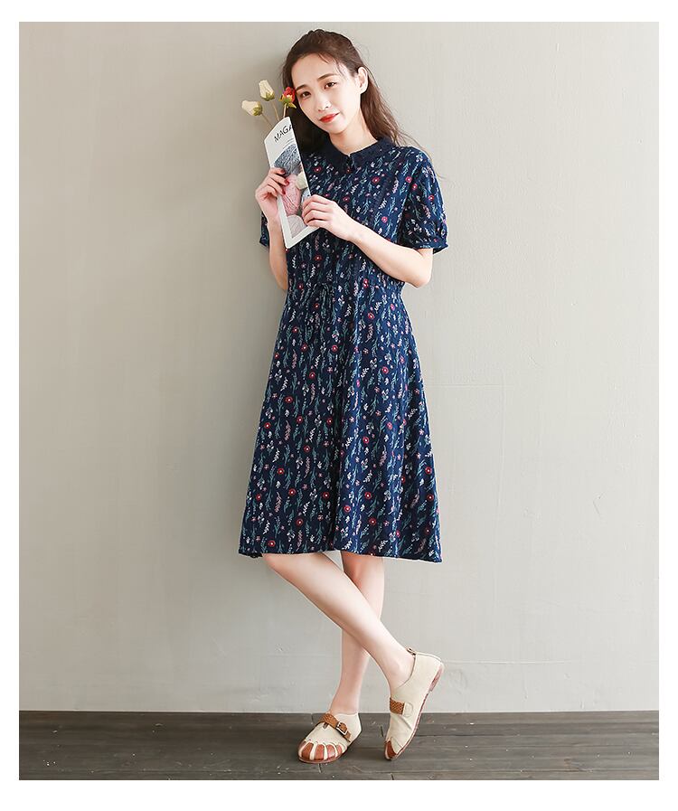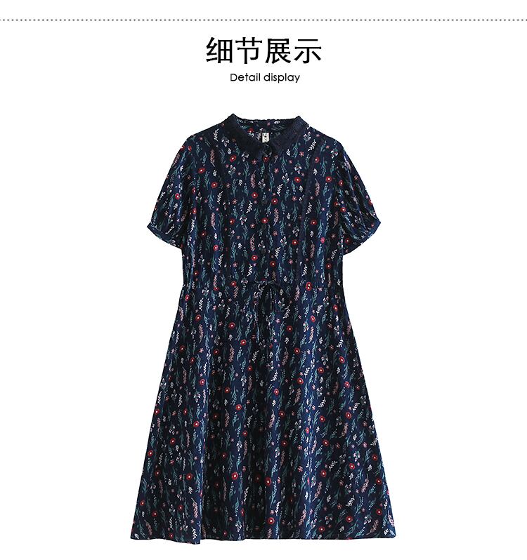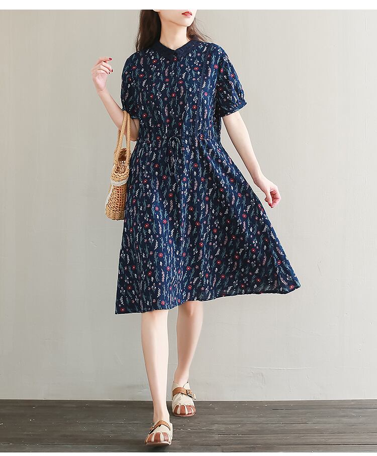 送料無料୨♥୧ サマーレディースAラインドレス スタンドカラーカラーフローラルプリントレースネイビーブルーヴィンテージドレス ワンピース 大人ガーリー スウィート キュート カジュアル 夏物 花柄 レースアップ フラワーデザイン ビンテージ AOS99955276551