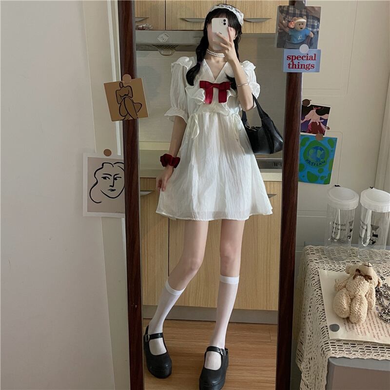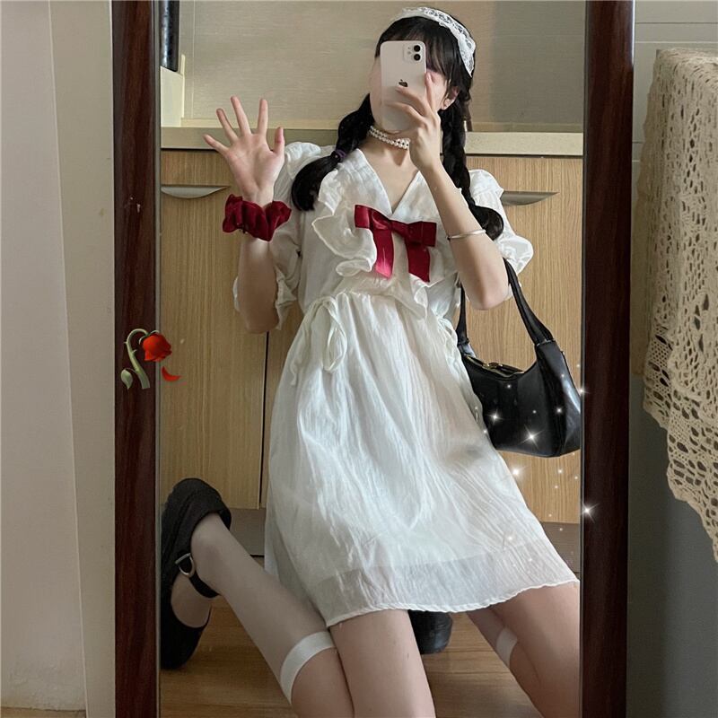 送料無料୨♥୧ スタイルサマーレディースホワイトミニドレス Vネックフリルリボンルーズ半袖スリーブ ショート ハーフスリーブ ラッフル 大人ガーリー スウィート キュート カジュアル 夏物 AOS38004227774