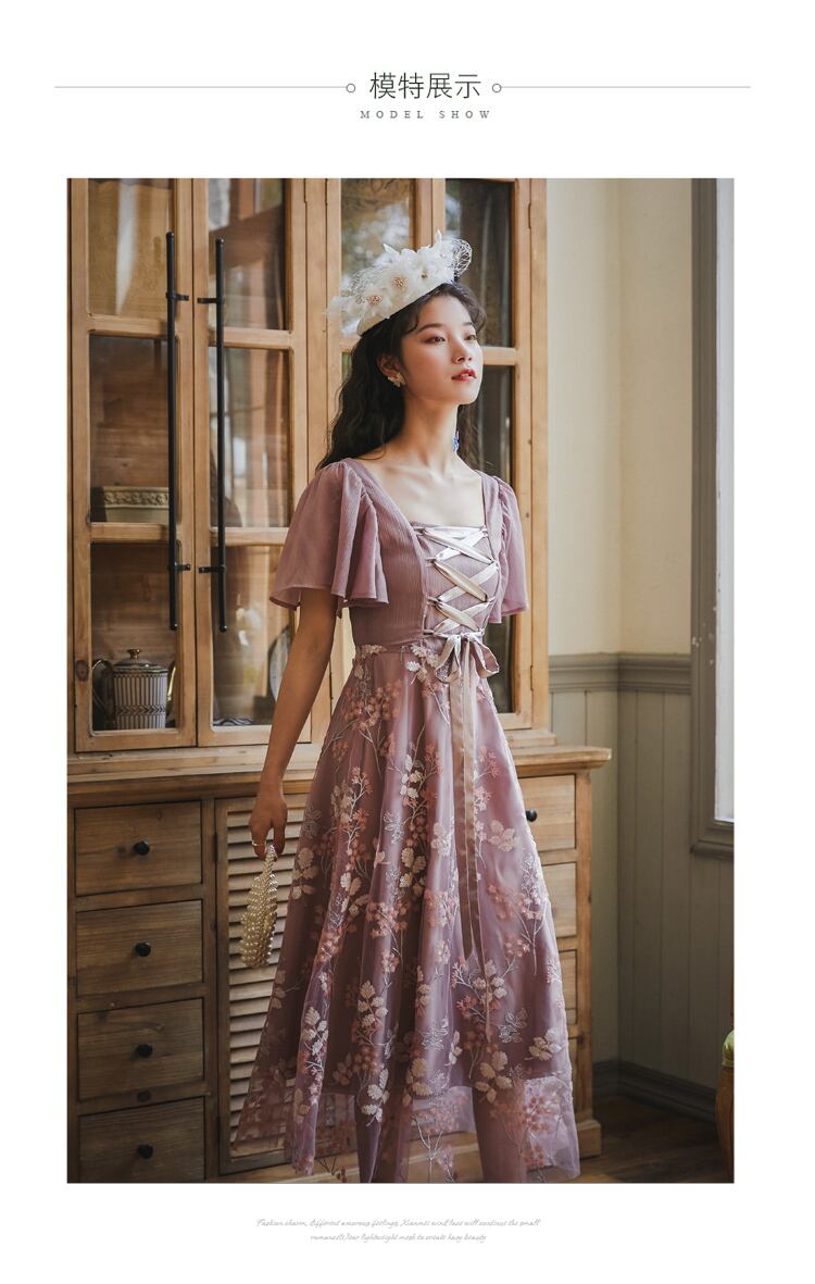 送料無料୨♥୧ サマーレディースミディドレス カラーバンドフローラル刺繍スリーブ 夏物 花柄 パープル スクウェア AOS16456350674