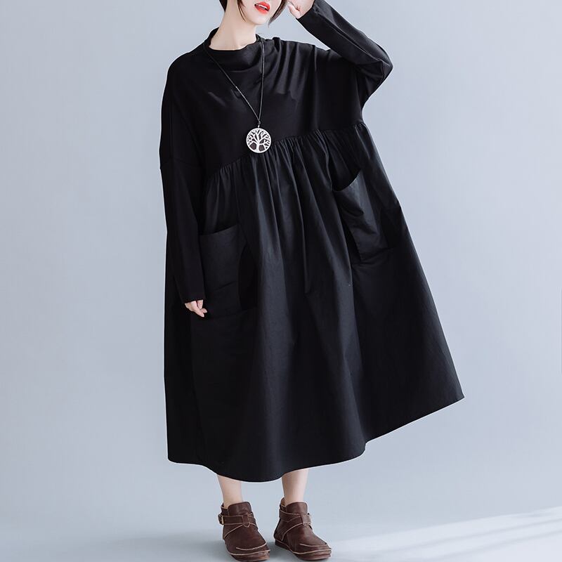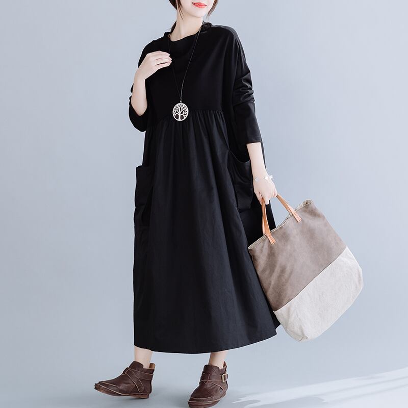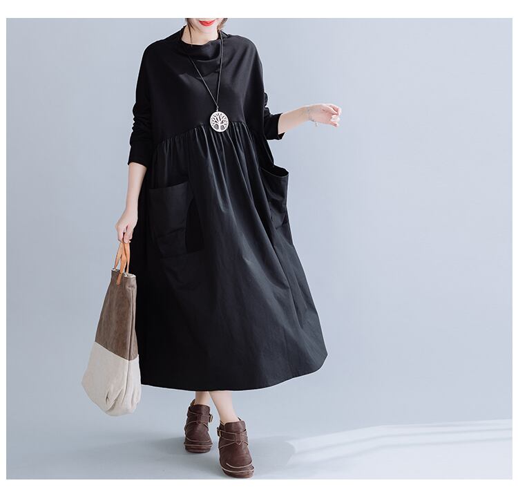 送料無料୨♥୧ オータムウィンターレディースロングドレス スタンドカラーカラーパッチワークルーズガウンブラックヴィンテージ 秋物 冬物 ビンテージ AOS34492465582