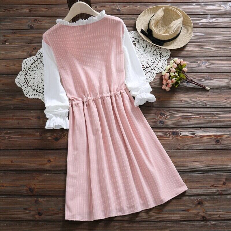 送料無料୨♥୧ スタイルスプリングオータムレディースドレス パッチワークブルーリボン長袖スリーブストライプ ロング ピンク 大人ガーリー スウィート キュート カジュアル 春物 秋物 AOS45967310062