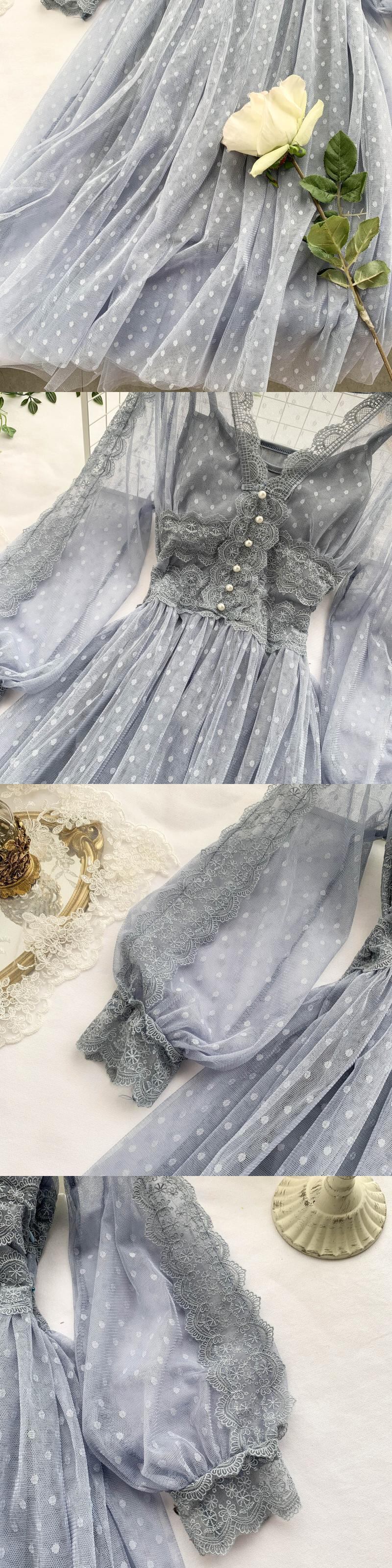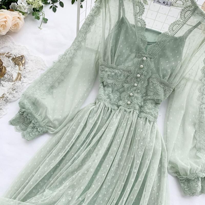 送料無料୨♥୧ オータムレディースロングドレス Vネックグリーン水玉メッシュ ピンク 秋物 AOS10989356881