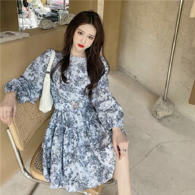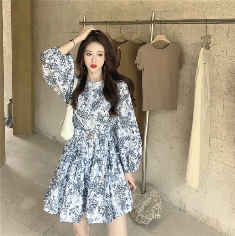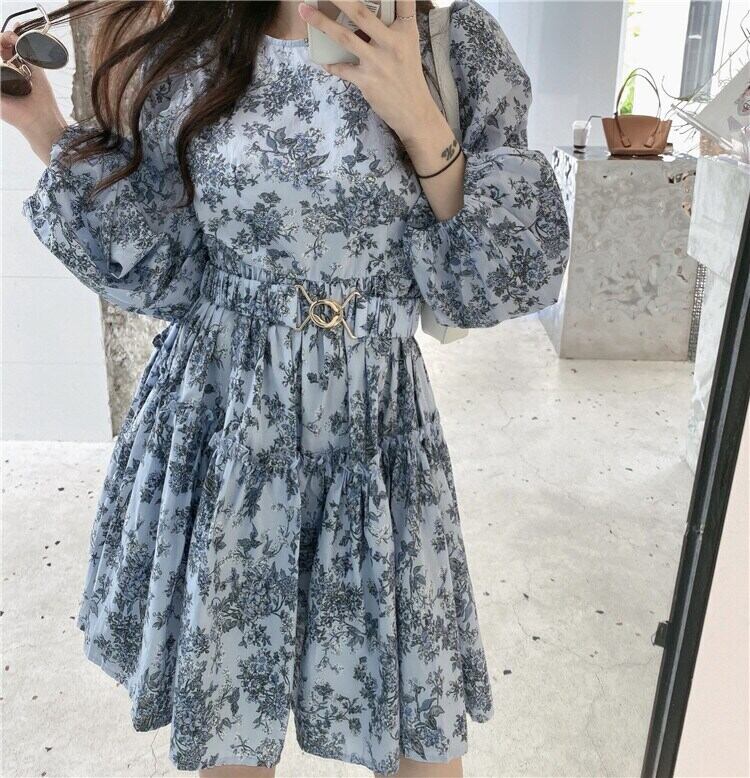 送料無料୨♥୧ スプリングレディースミニドレス ブルーフローラルプリントスリーブベルト ランタンスリーブ 春物 ハーネス 花柄 Oネック AOS15225035125