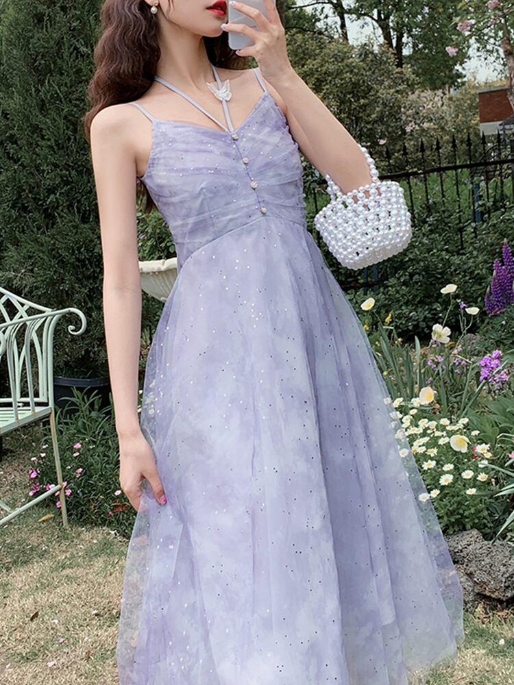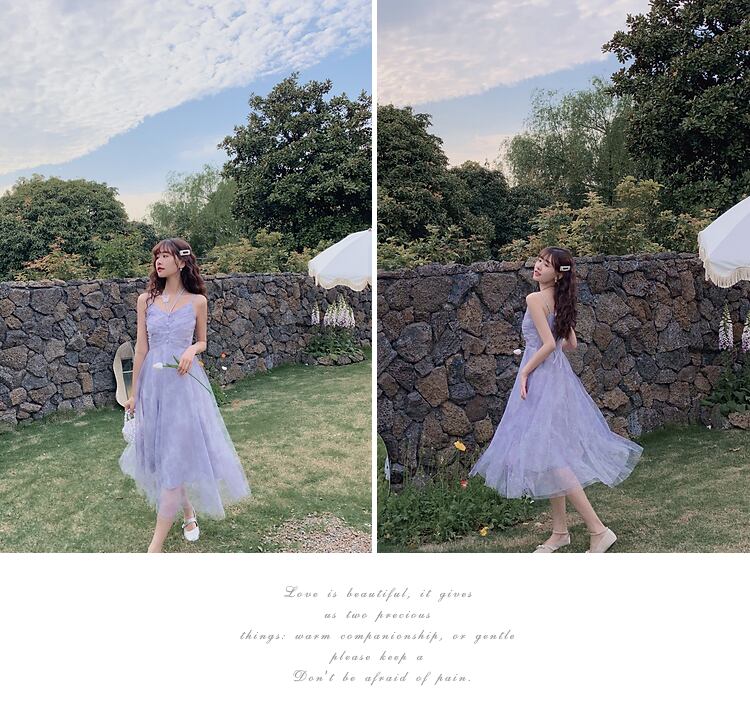 送料無料୨♥୧ サマーレディースミディドレス Vネックノースリーブメッシュフリル ラッフル 大人ガーリー スウィート キュート カジュアル 夏物 パープル AOS28384043143