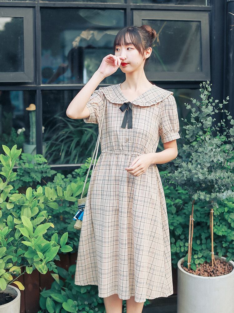 送料無料୨♥୧ サマーレディース格子柄ドレス カラーリボン 大人ガーリー スウィート キュート カジュアル 夏物 パープル AOS43092283109