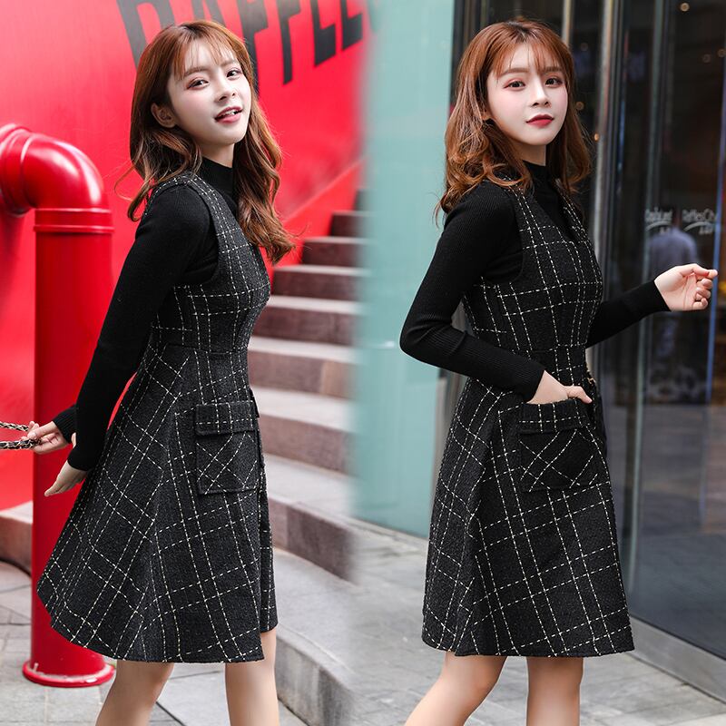 送料無料୨♥୧ スタイルオータムウィンターレディースミニドレス Vネックブラック格子柄ジッパーノースリーブウール 秋物 冬物 ヨーロピアン AOS92296807143