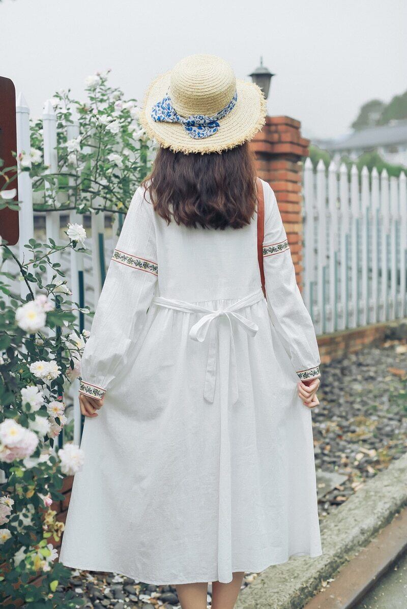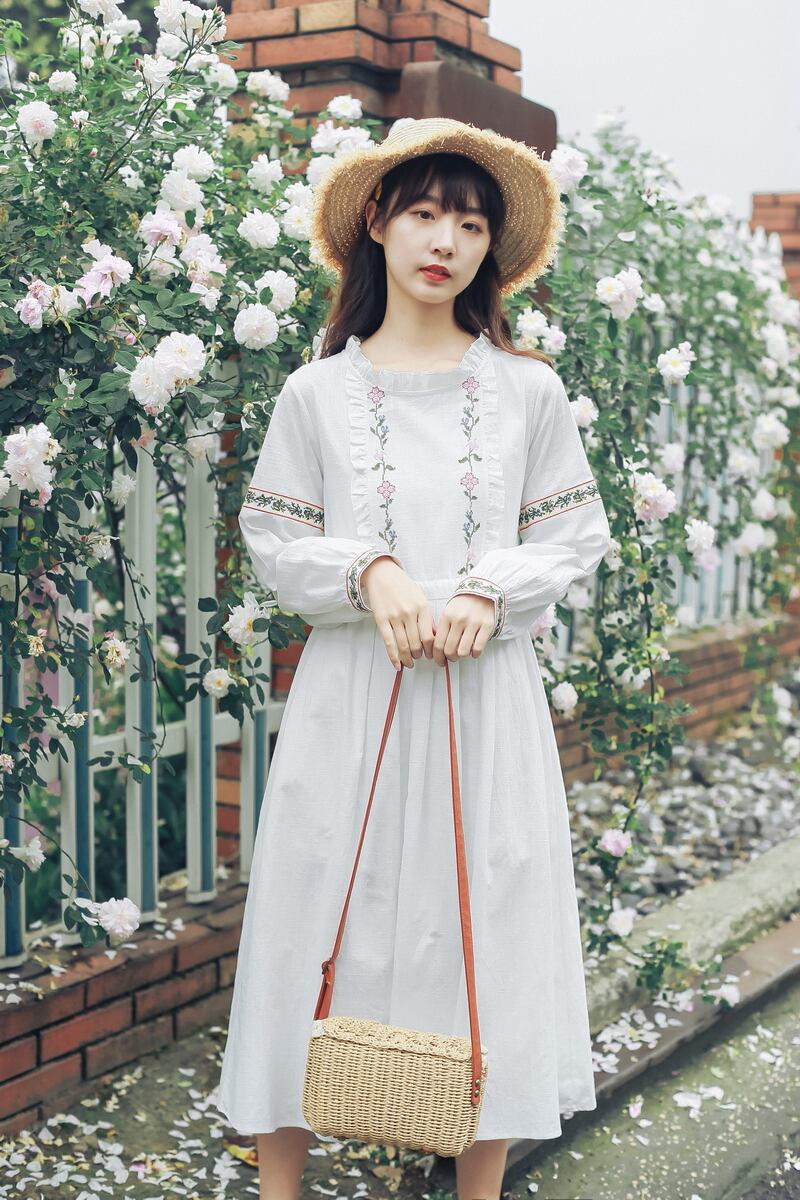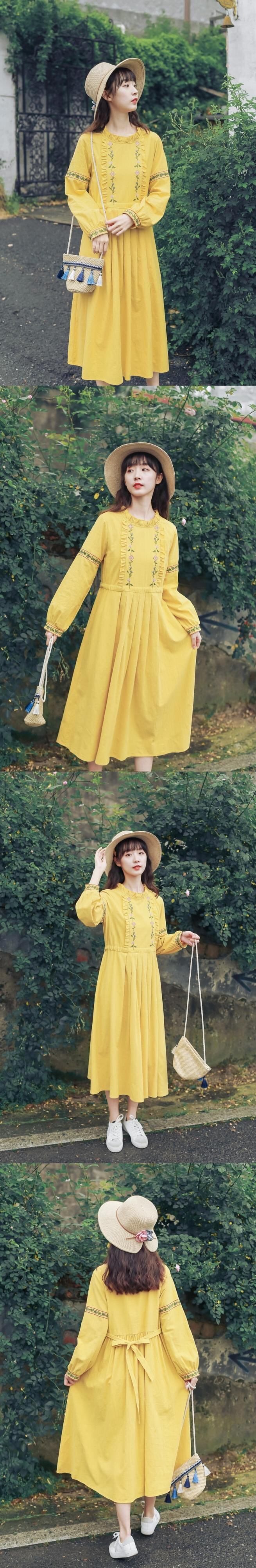 送料無料୨♥୧ オータムスプリングレディースミディドレス ホワイトグリーンイエローフローラル刺繍プリーツ コットン 大人ガーリー スウィート キュート カジュアル 春物 秋物 花柄 AOS52170216914
