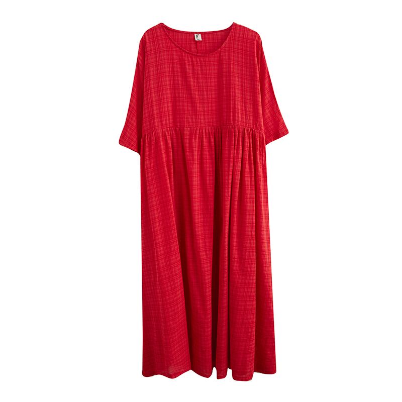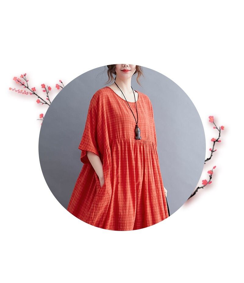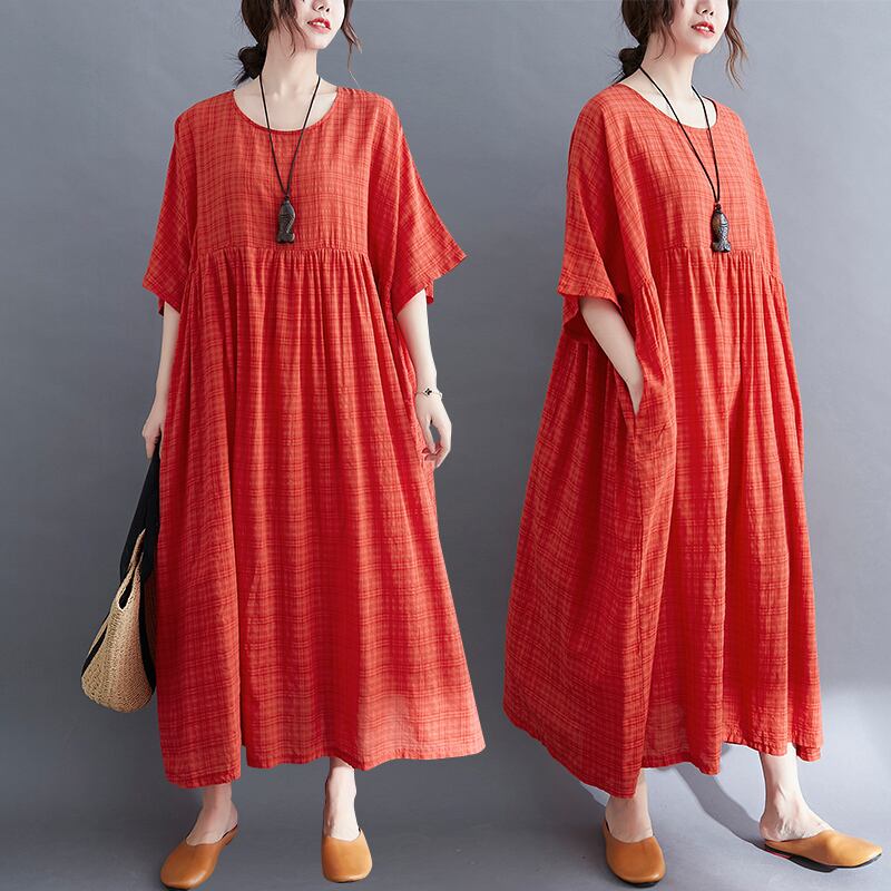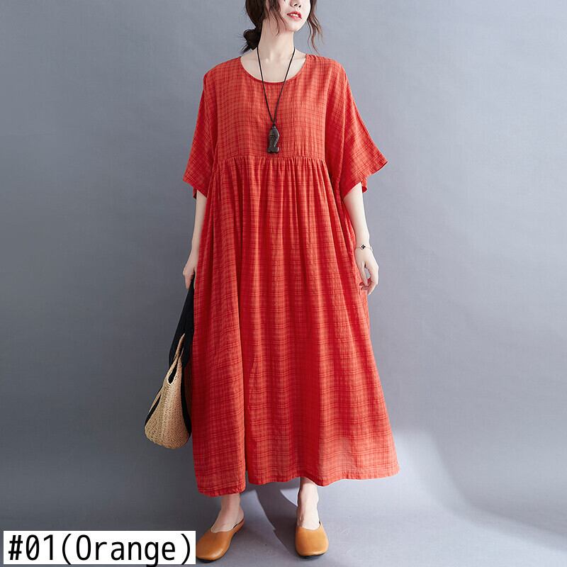 送料無料୨♥୧ エスニックレディースサマーマキシドレス ソリッド ルーズオレンジ格子柄Oネックスタンダードガウン レトロ 夏物 ソリッドカラー AOS45620515505
