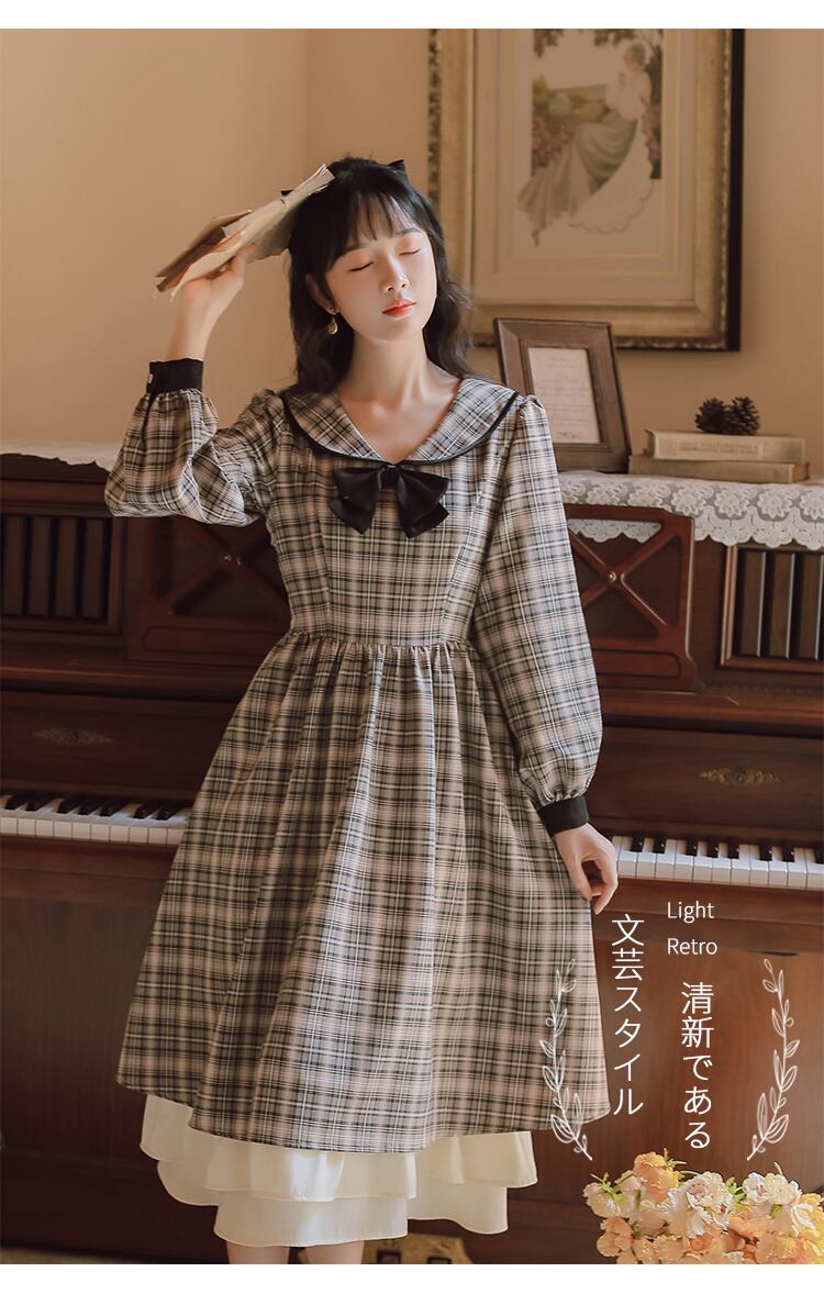 送料無料୨♥୧ スタイルスプリングオータムレディースミディドレス カラーリボン格子柄ヴィンテージ長袖スリーブフリルAラインドレス ワンピース ロング ラッフル 春物 秋物 ビンテージ ヨーロピアン AOS97280055426