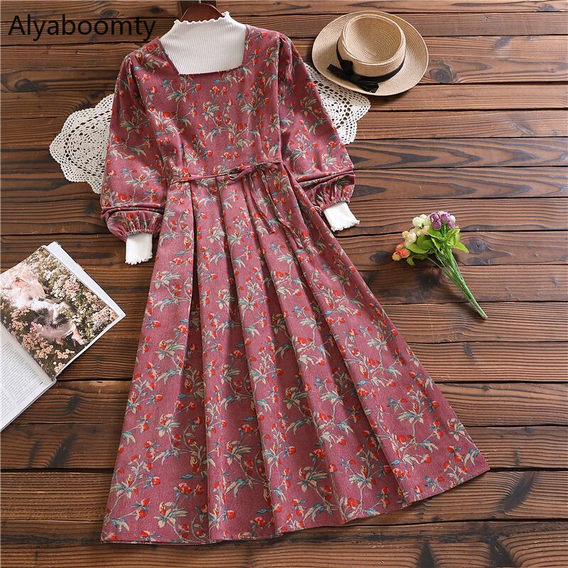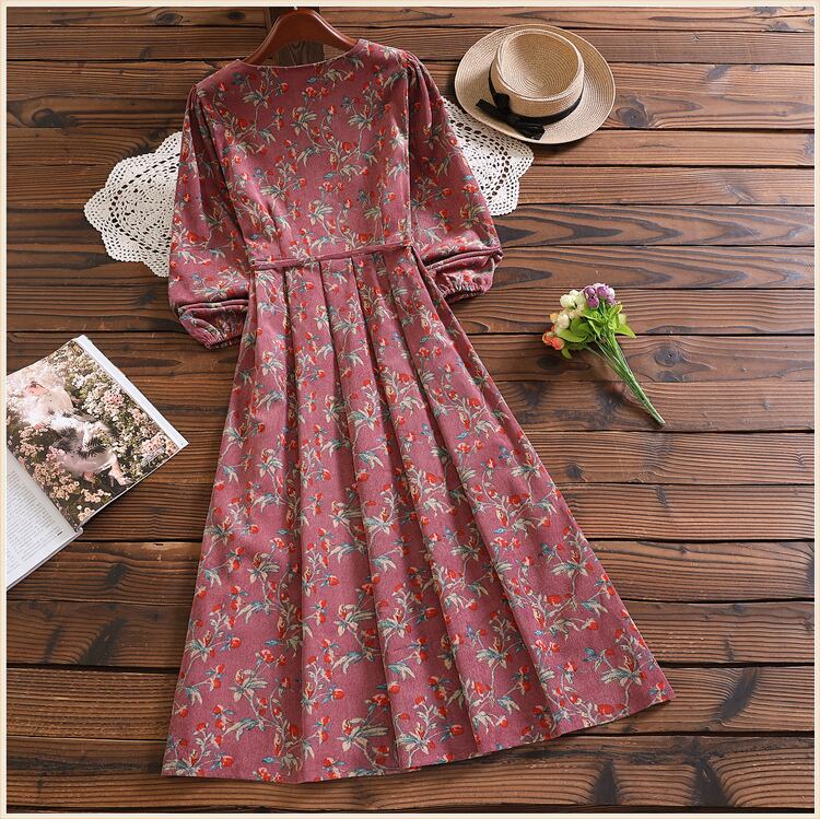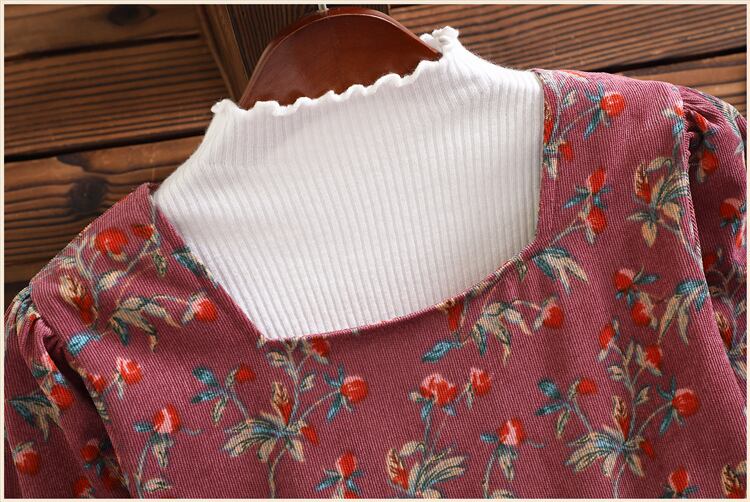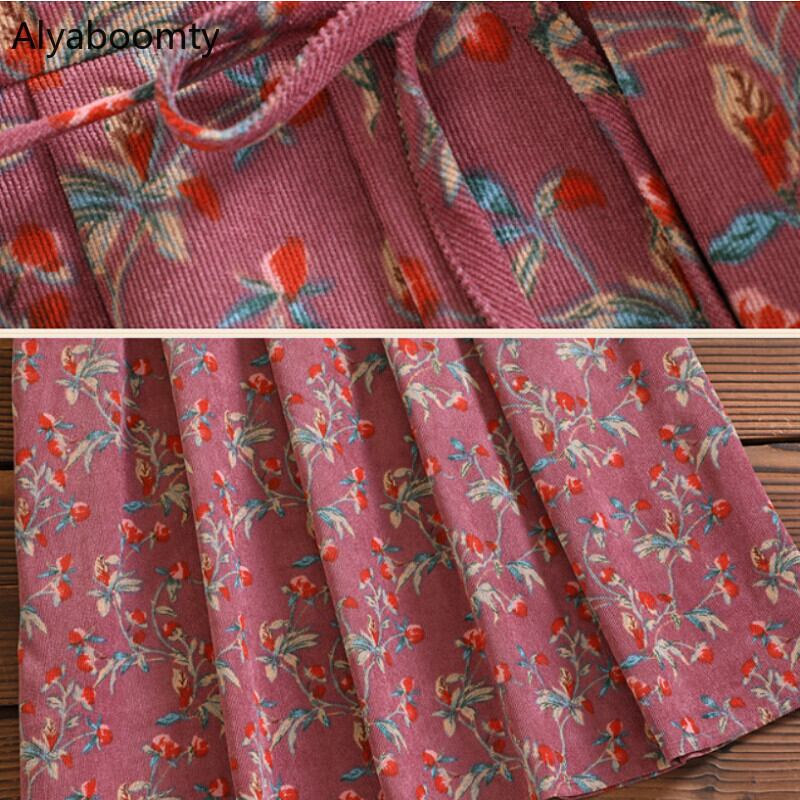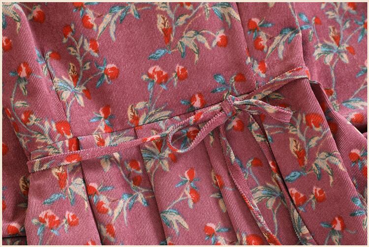 送料無料୨♥୧ オータムウィンターレディースヴィンテージドレス カラーフローラルプリントレッドコーデュロイプリーツ 大人ガーリー スウィート キュート カジュアル 秋物 冬物 花柄 スクウェア ビンテージ AOS77501521458