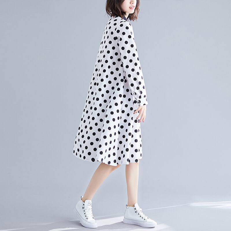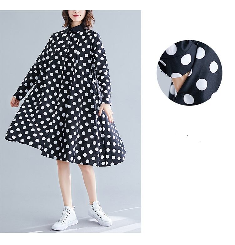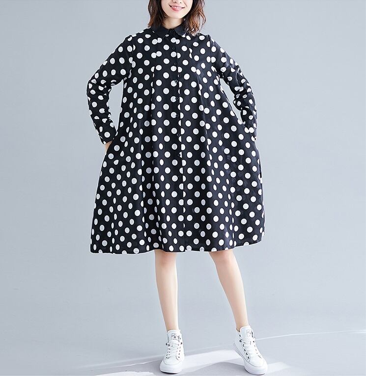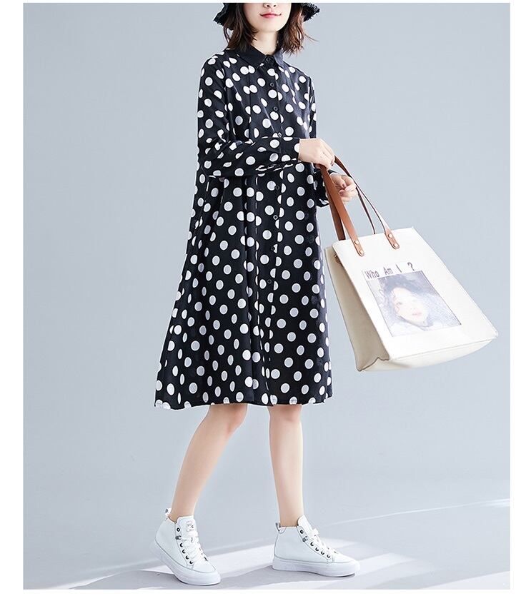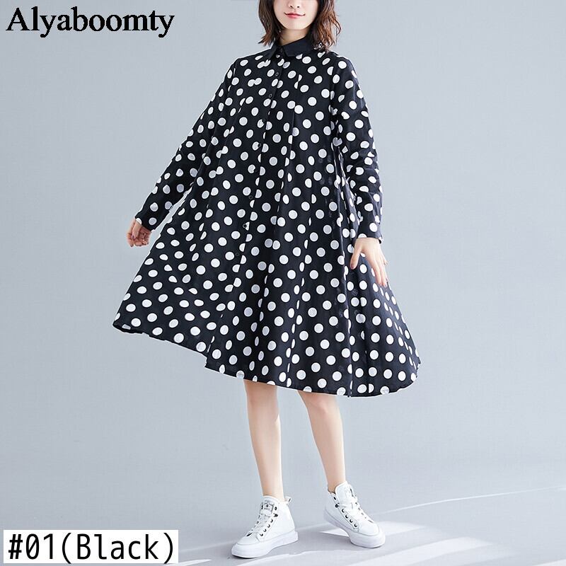 送料無料୨♥୧ オータムスプリングレディースシャツ ドレス カラー水玉ブラックホワイトルーズ 大きめサイズ 春物 秋物 AOS4768354762