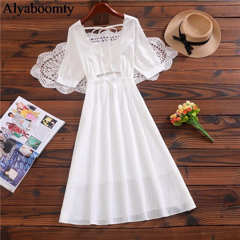 送料無料୨♥୧ サマーレディースミディドレス カラーホワイトブルーバンドスリーブ コットン 大人ガーリー スウィート キュート カジュアル 夏物 スクウェア AOS10832018011