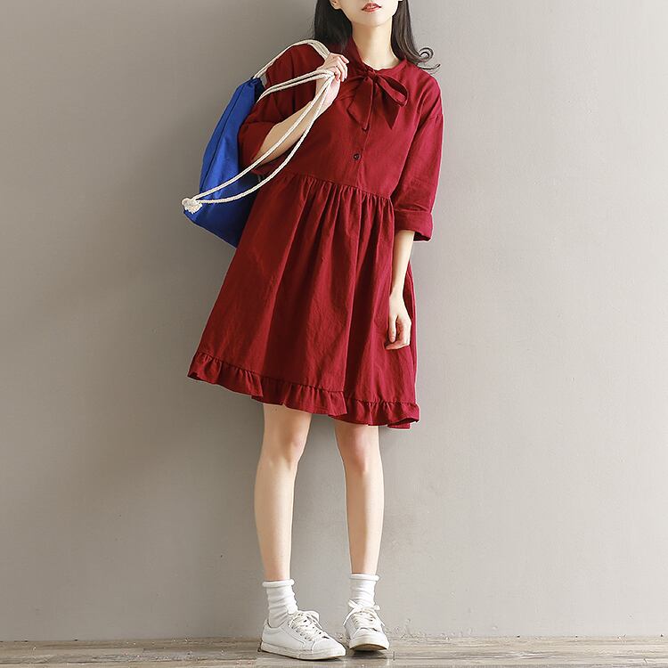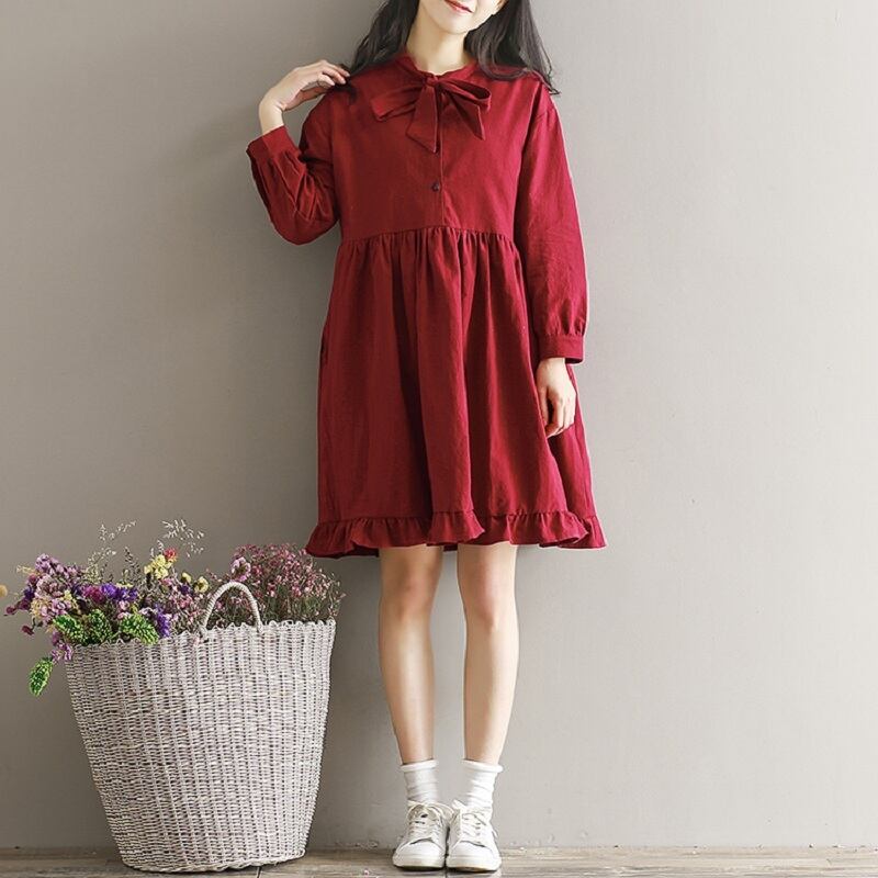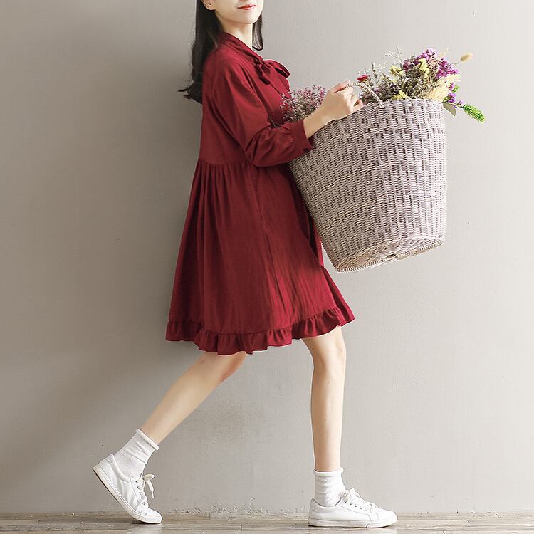 送料無料୨♥୧ スプリングオータムレディースドレス ルーズレッドヴィンテージラッフル コットン 大人ガーリー スウィート キュート カジュアル 春物 秋物 ビンテージ AOS79298368384