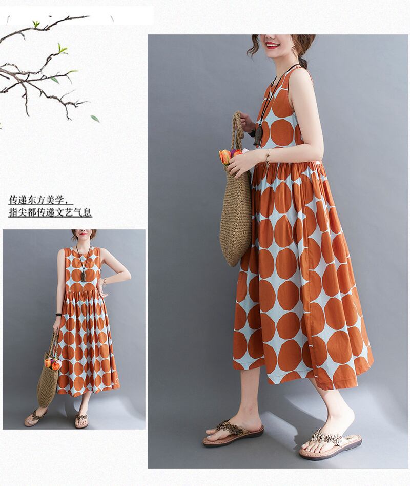 送料無料୨♥୧ サマーレディースドレス ブラックオレンジ水玉ノースリーブロングヴィンテージ コットン 夏物 ビンテージ AOS89940332790