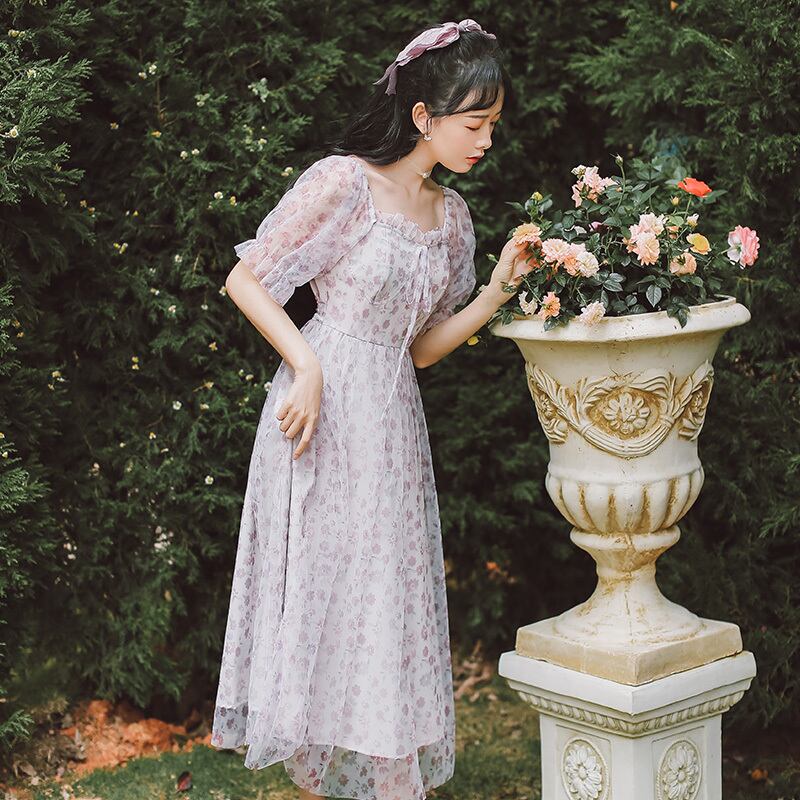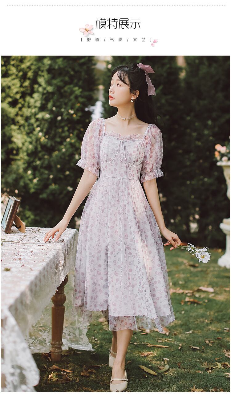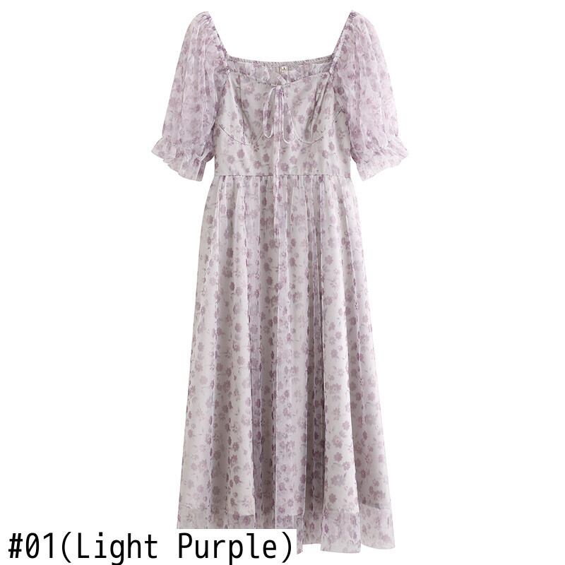 送料無料୨♥୧ サマーレディースメッシュドレス カラーフローラルプリントバンドミディ 夏物 花柄 パープル スクウェア AOS73282119958