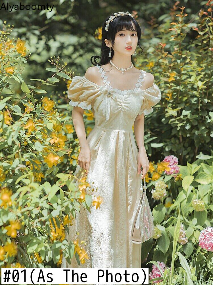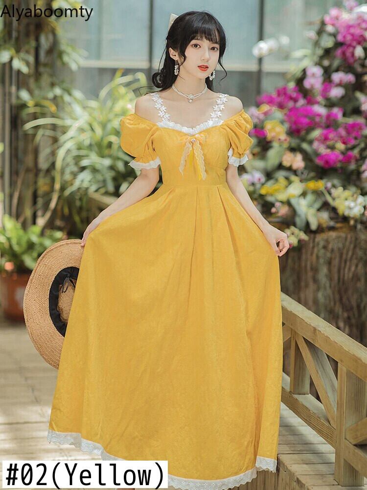 送料無料୨♥୧ サマーレディースロングレースフリルドレス ストラップ オフショルダーベージュイエロージャカード ラッフル 夏物 AOS56732967717