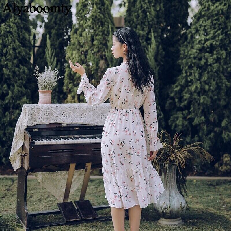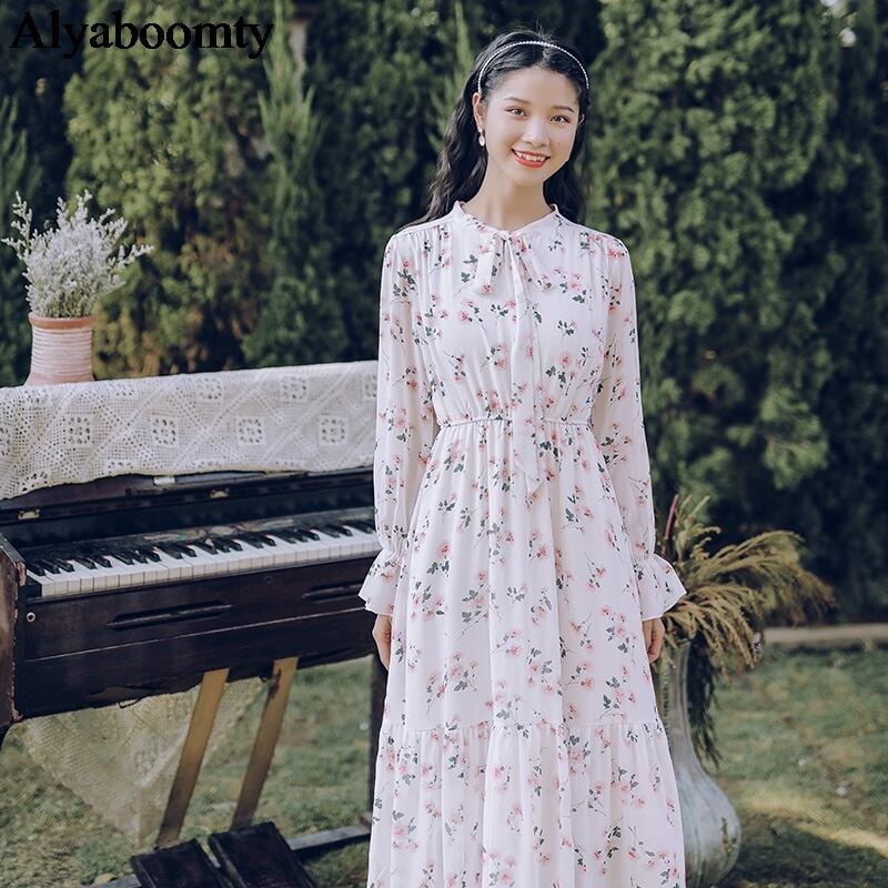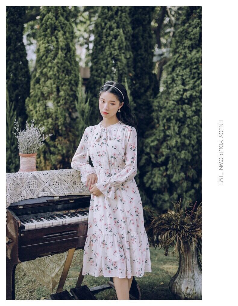 送料無料୨♥୧ オータムスプリングミディドレス スタンドカラーカラーフローラルプリントシフォンフリルロング ラッフル 大人ガーリー スウィート キュート カジュアル 春物 秋物 花柄 AOS3004685368
