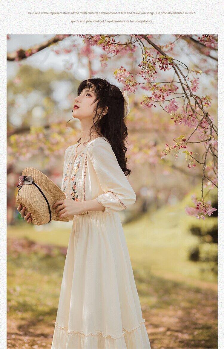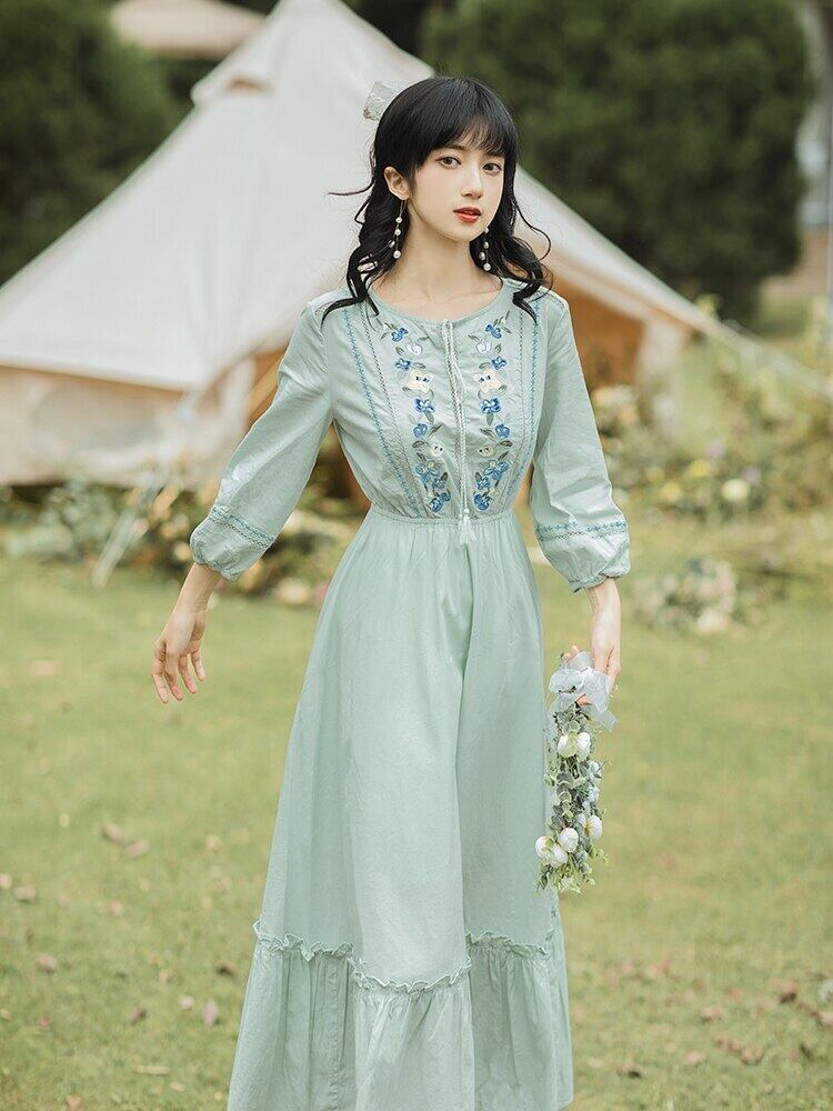 送料無料୨♥୧ レディースミディグリーンドレス フローラル刺繍ヴィンテージスプリング七部袖スリーブフリル コットン ラッフル 大人ガーリー スウィート キュート カジュアル 春物 花柄 ビンテージ AOS44202531937