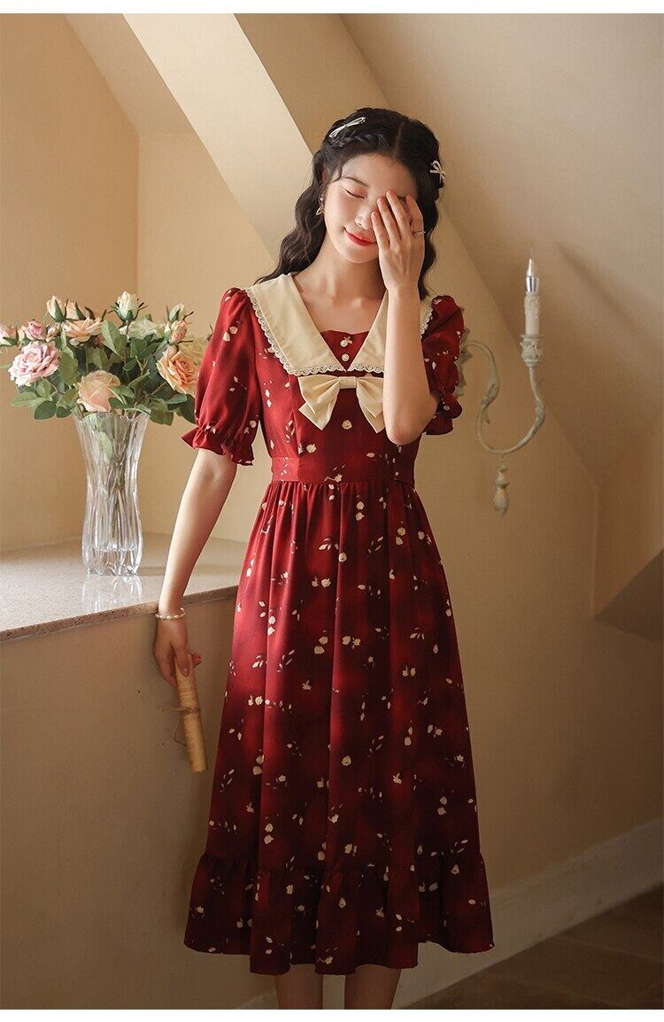 送料無料୨♥୧ サマーAラインロングドレス カラーリボンフローラルミディヴィンテージプリントフリル ラッフル 大人ガーリー スウィート キュート カジュアル 夏物 花柄 ビンテージ AOS75333482124
