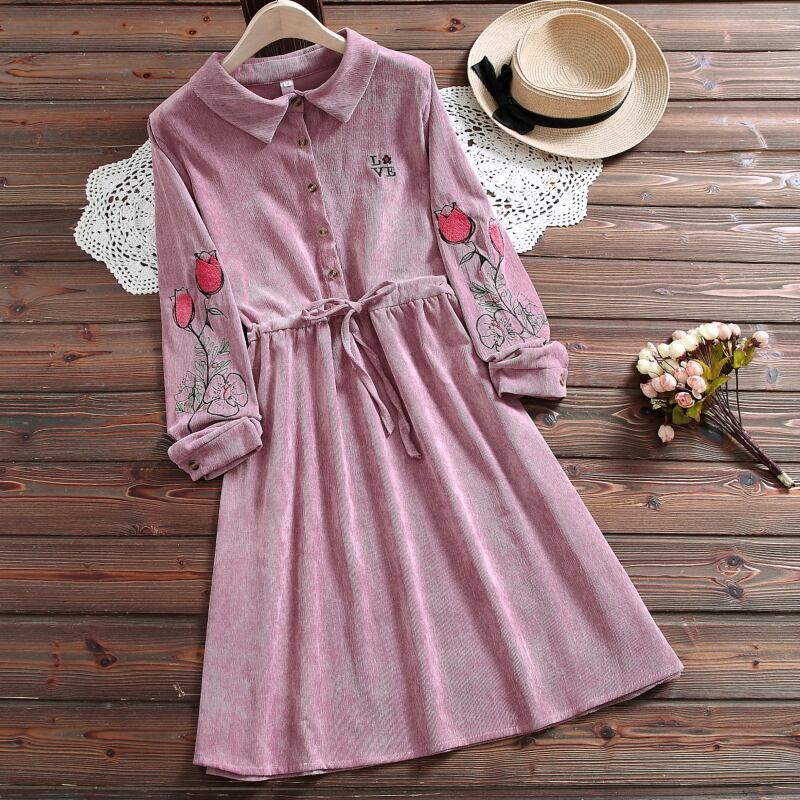 送料無料୨♥୧ オータムスプリングレディースAラインドレス カラーネイビーブルーフローラルコーデュロイ刺繍ドレス ワンピース ピンク 大人ガーリー スウィート キュート カジュアル 春物 秋物 花柄 AOS19861706477
