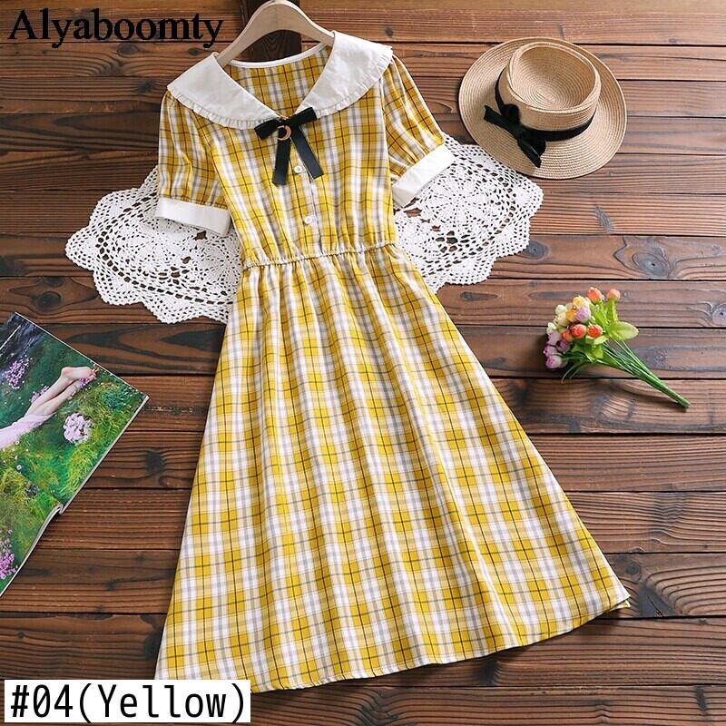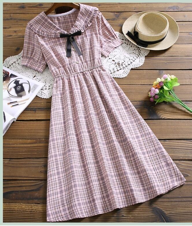 送料無料୨♥୧ スタイルサマーレディースドレス リボンカラー格子柄ヴィンテージ半袖スリーブAラインミディ ショート ハーフスリーブ 大人ガーリー スウィート キュート カジュアル 夏物 パープル ビンテージ AOS55862199766