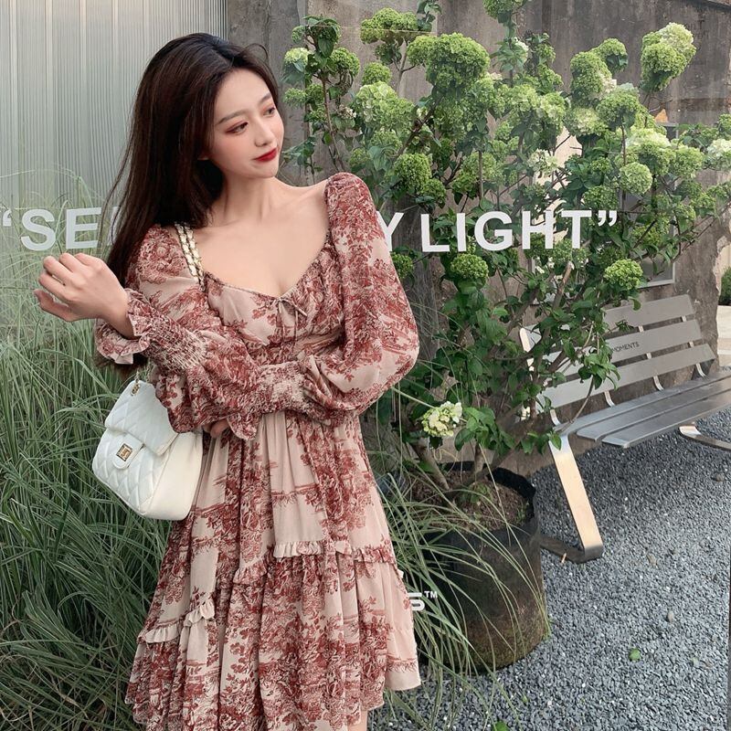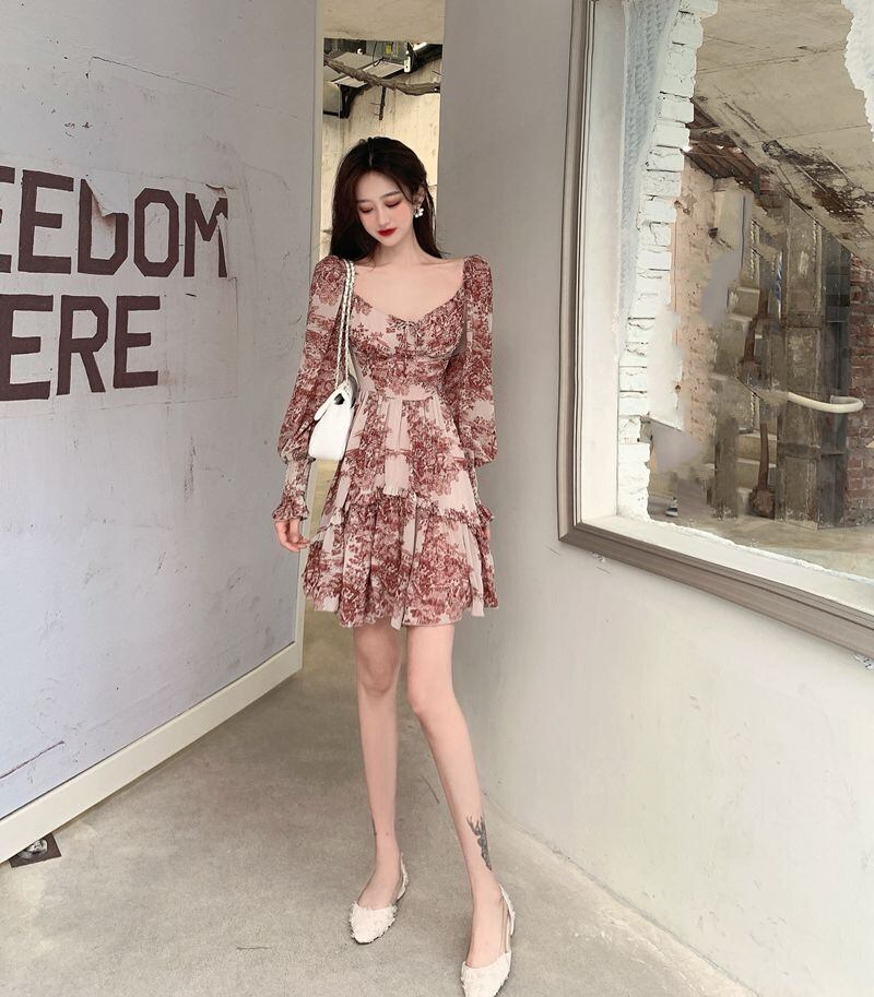 送料無料୨♥୧ スプリングサマーレディースミニドレス ヴィンテージプリントシフォンフリル ラッフル 春物 夏物 ビンテージ AOS78521133344