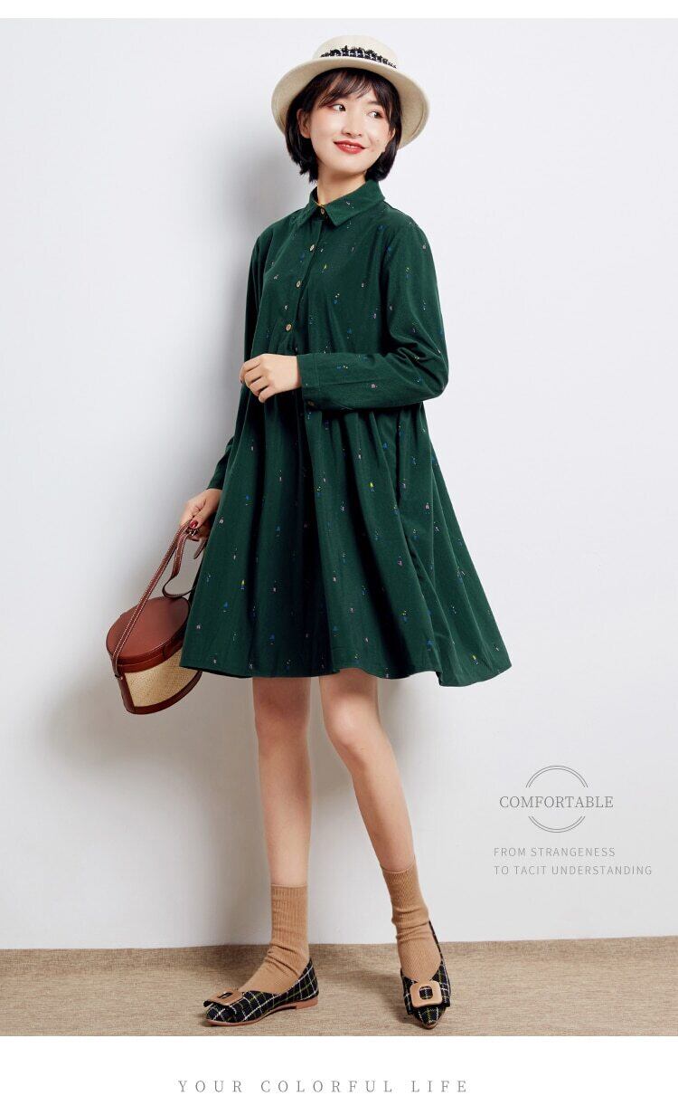 送料無料୨♥୧ ヴィンテージレディースルーズドレス カラースリーブフェミニーズコーデュロイグリーンスタンダード レトロ ビンテージ AOS86175241627