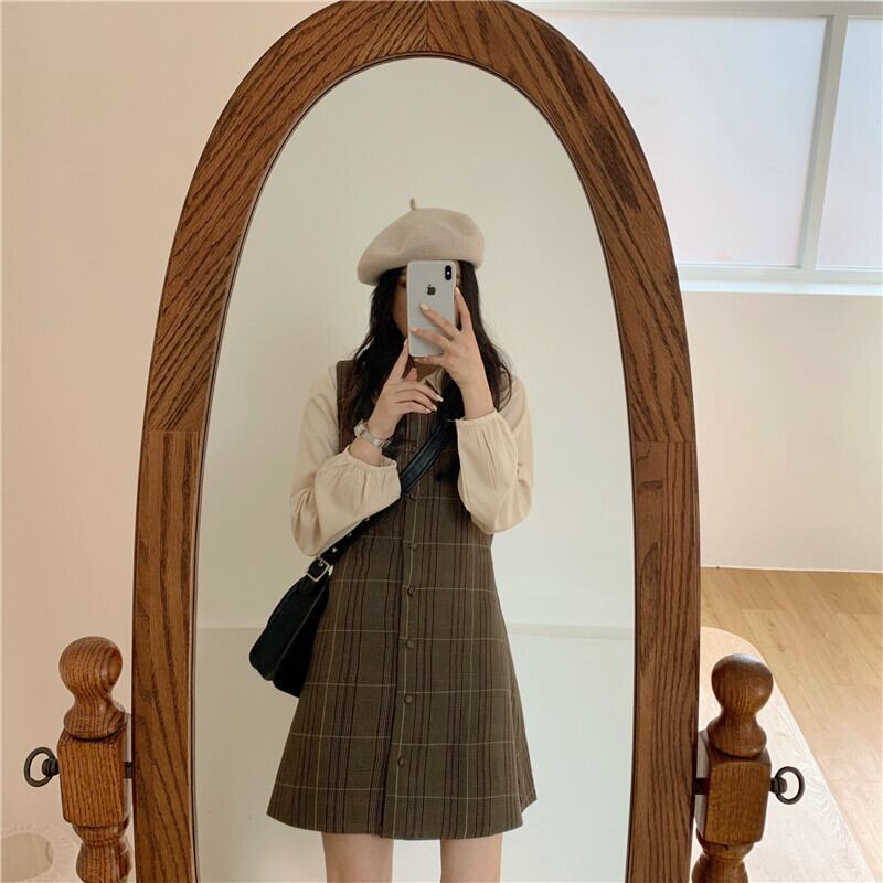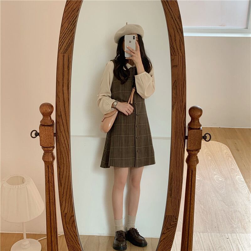 送料無料୨♥୧ スタイルスプリングオータムレディースミニドレス カラーブラウン格子柄ノースリーブヴィンテージ 大人ガーリー スウィート キュート カジュアル 春物 秋物 スクウェア ビンテージ ヨーロピアン AOS77945527603