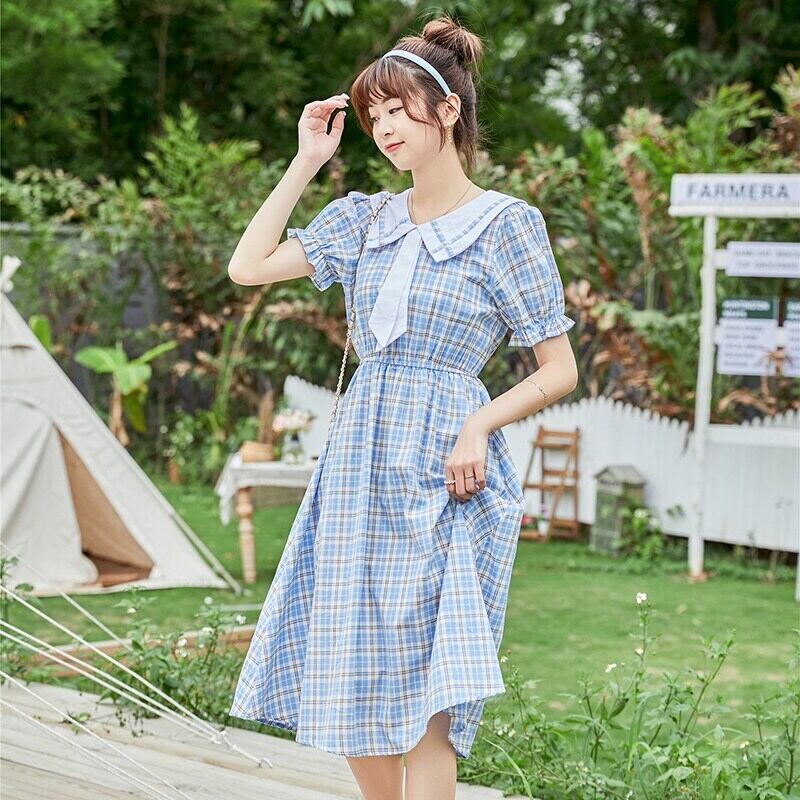 送料無料୨♥୧ スタイルサマーレディースAラインドレス カラーブルー格子柄 ピンク エラスティック 伸縮 大人ガーリー スウィート キュート カジュアル 夏物 AOS56958238951