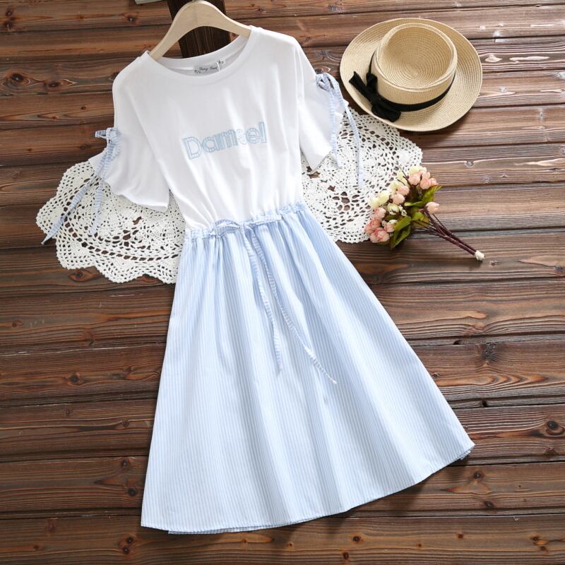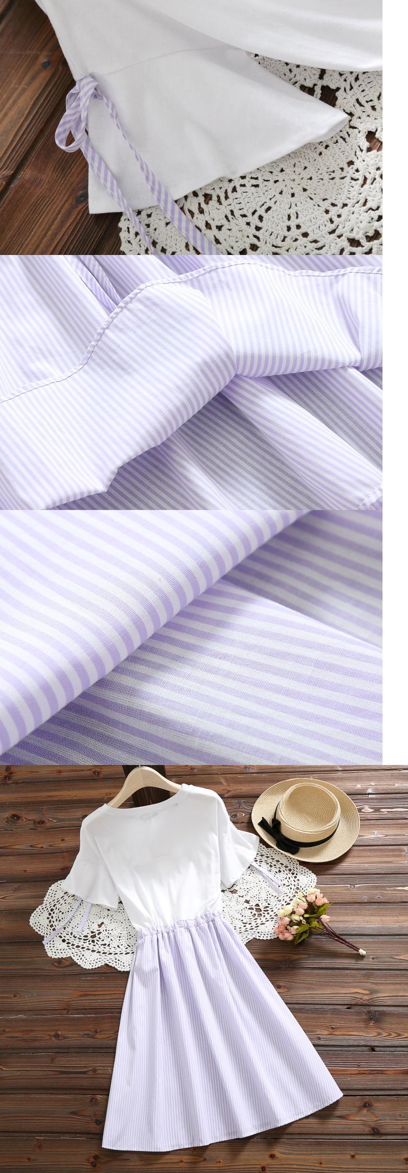 送料無料୨♥୧ スタイルパッチワークサマーレディースドレス 刺繍ストライプブルー コットン 大人ガーリー スウィート キュート カジュアル 夏物 パープル AOS49196306889